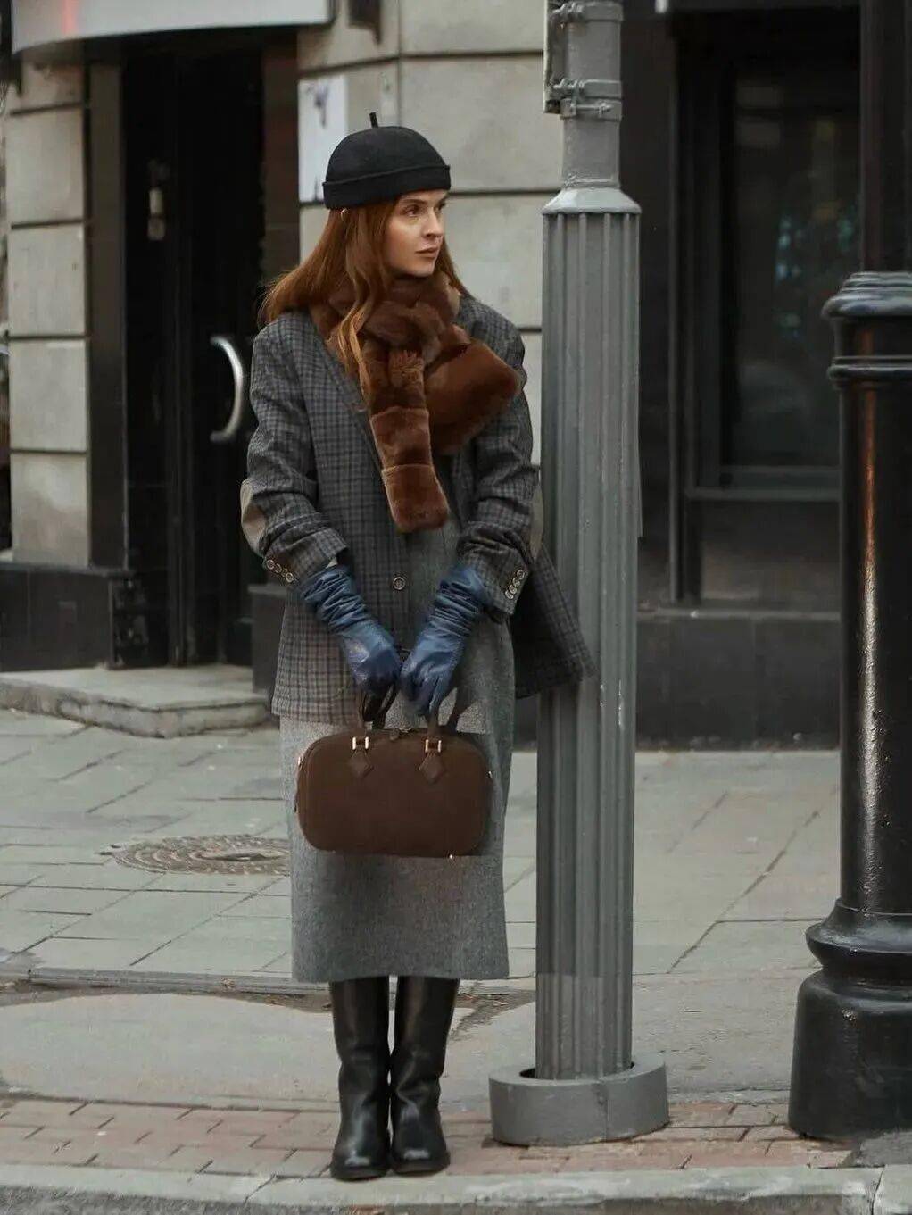 棕色配灰色,冷暖色调交织,沉静中透出暖意,秋冬这样穿,氛围感最足。
