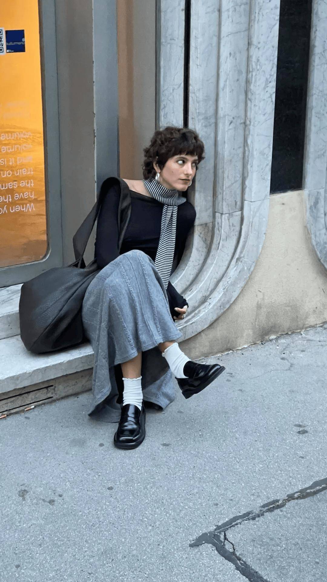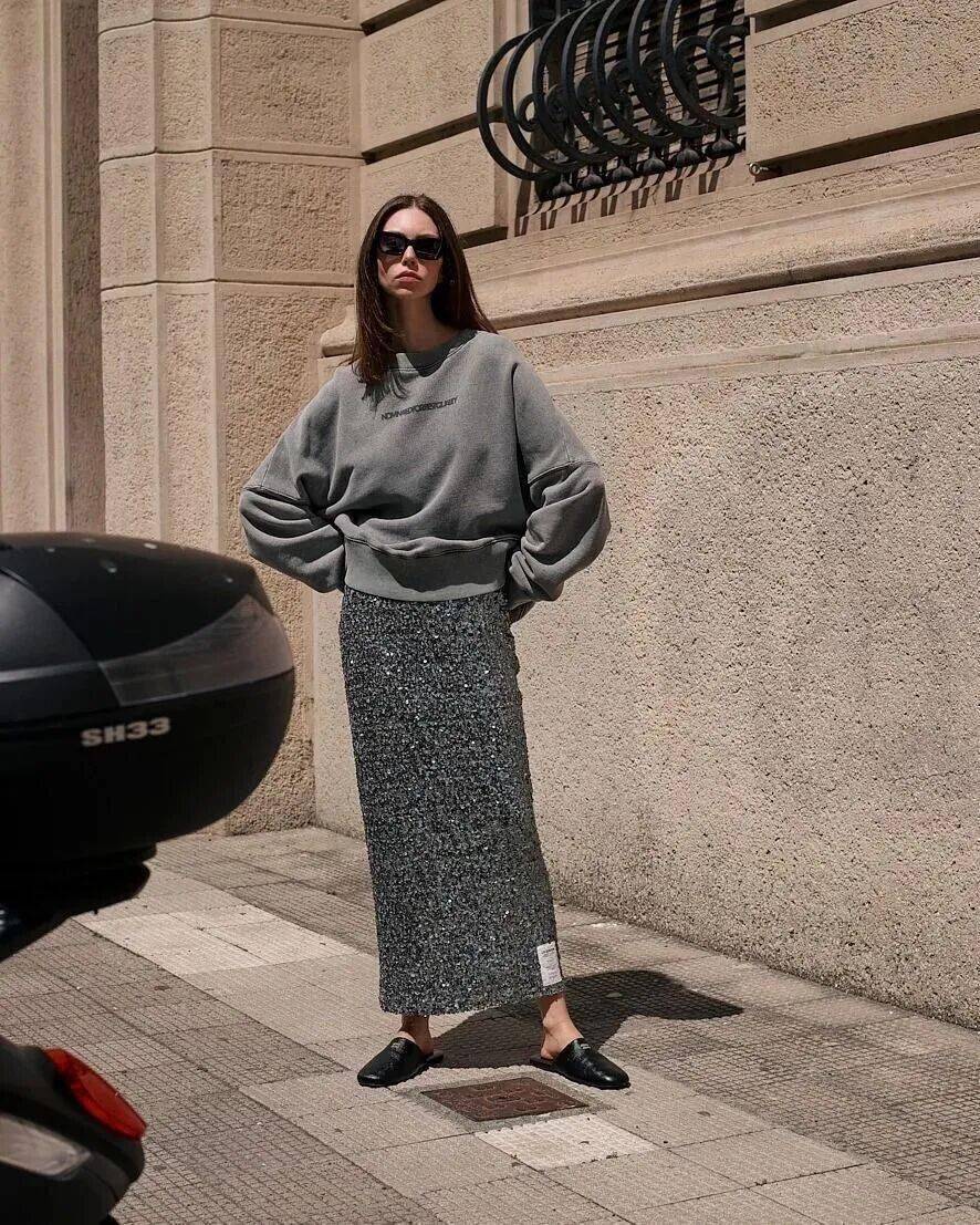重磅卫衣 + 灰色光泽感半裙。上重下轻,打破冬季着装的沉闷。灰色的中立性完美平衡了这种重量差异,让混搭变得合理又时髦。