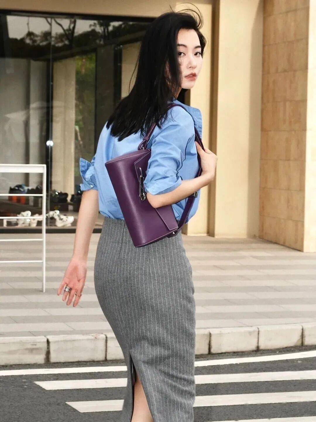 蓝色衬衫搭配灰色半裙,是恰到好处的舒适感,展现一个沉静、自信、充满内在力量的女性形象。