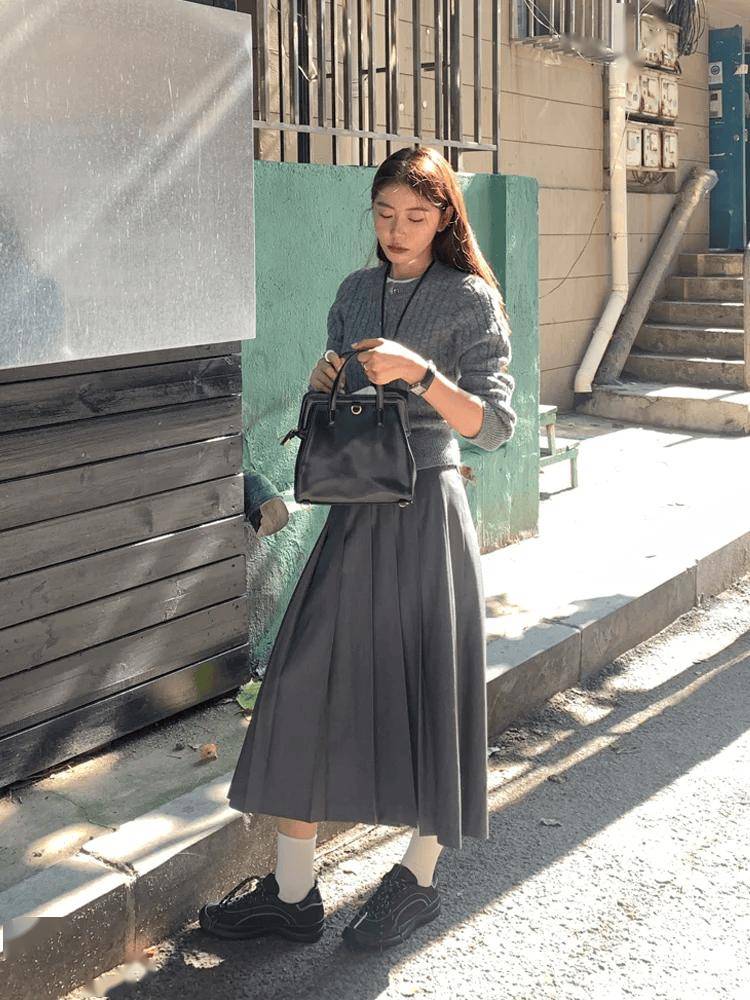 灰色百褶裙则时髦感与减龄感双双在线,百褶裙的灵动与冬日臃肿厚重的穿搭形成巧妙反差,能瞬间打破沉闷。