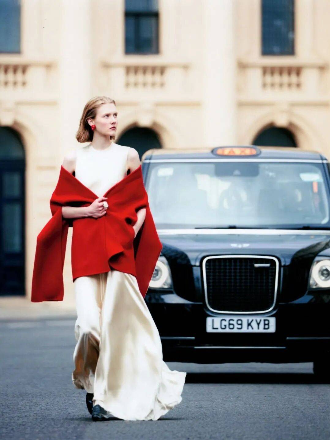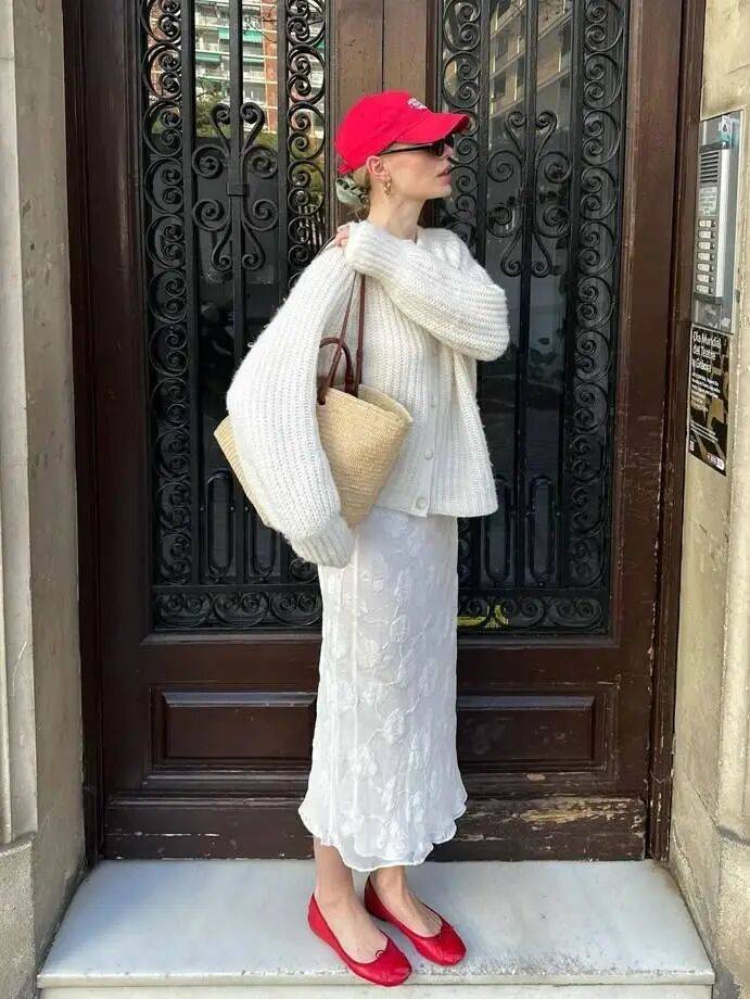 例如,一件云白色长裙搭配红色大衣,热烈却不刺眼,活泼中保有清雅。