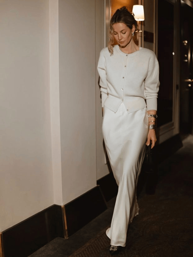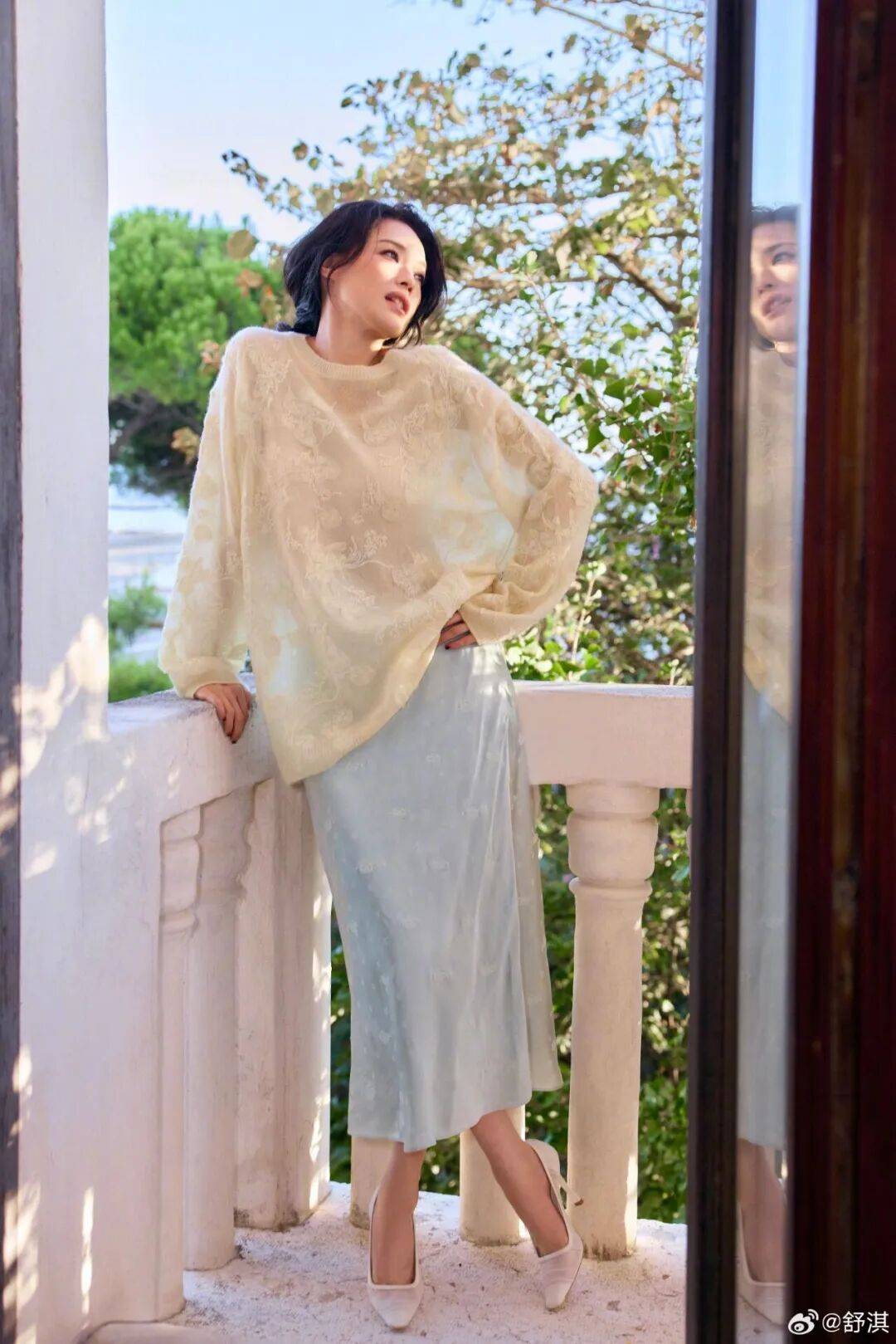 一条「云上舞白」的半身裙,尤其是质地柔软的缎面裙或针织裙,能为穿搭注入灵动与女性气息。