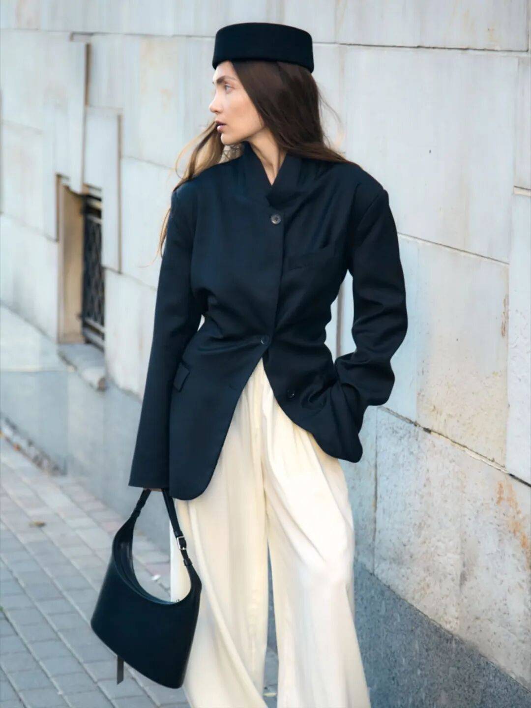 比如深色西装搭配云白色裤子,或是一件黑色连衣裙外披云白色大衣,在强烈的对比中达成视觉平衡,既庄重有力,又不失轻盈与现代。