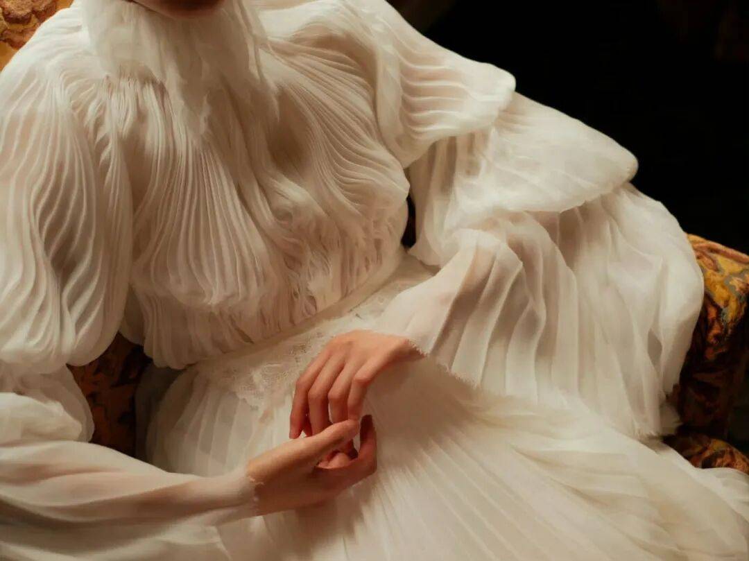 层叠的薄纱、细致的镂空,让白色产生了丰富的层次与空气感,宛如将一朵云穿在了身上,极致浪漫中蕴含着一股沉静的力量。