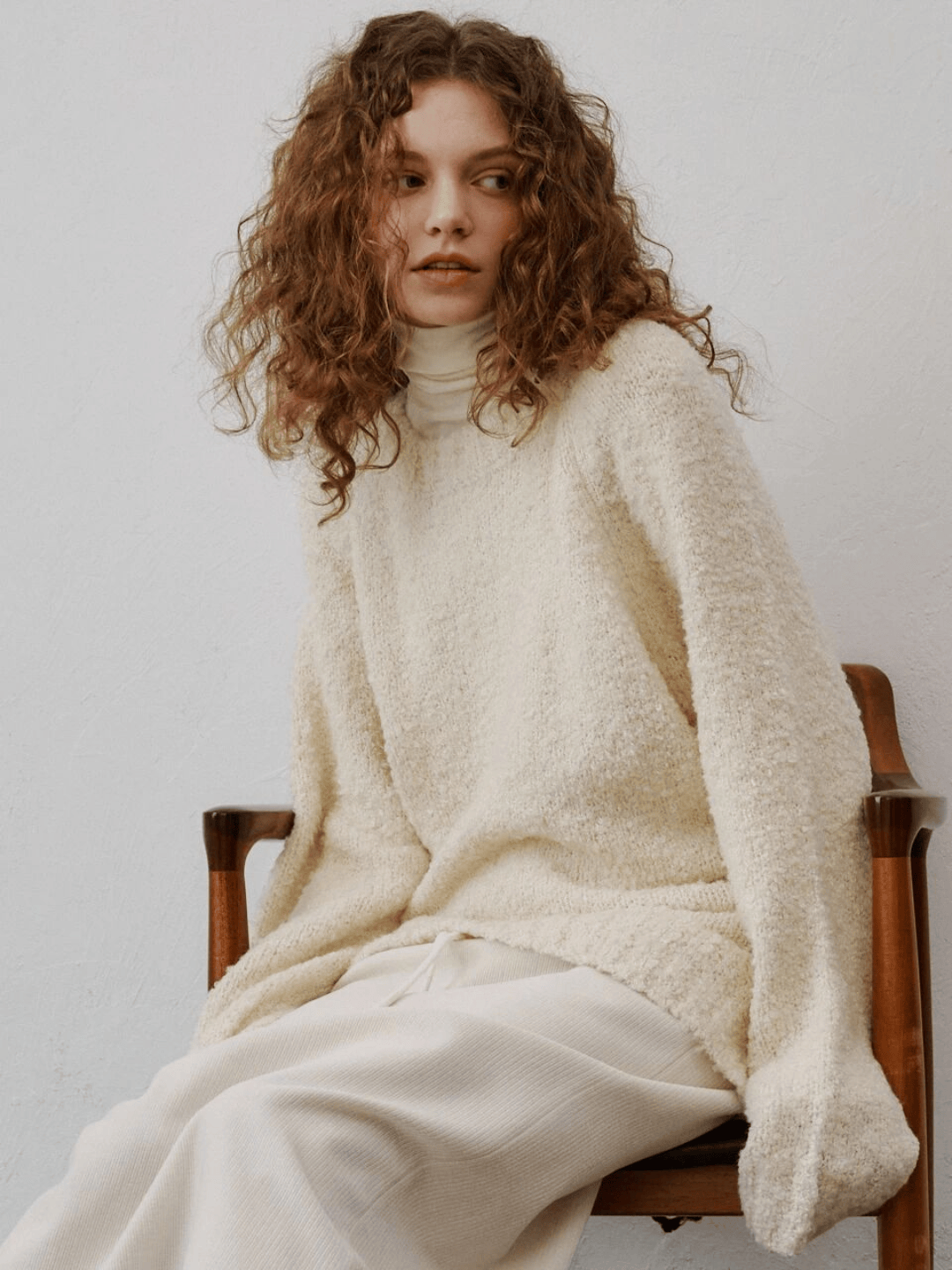 宽松的廓形带来被包裹的安全感,高领设计则增添一丝静谧的仪式感。