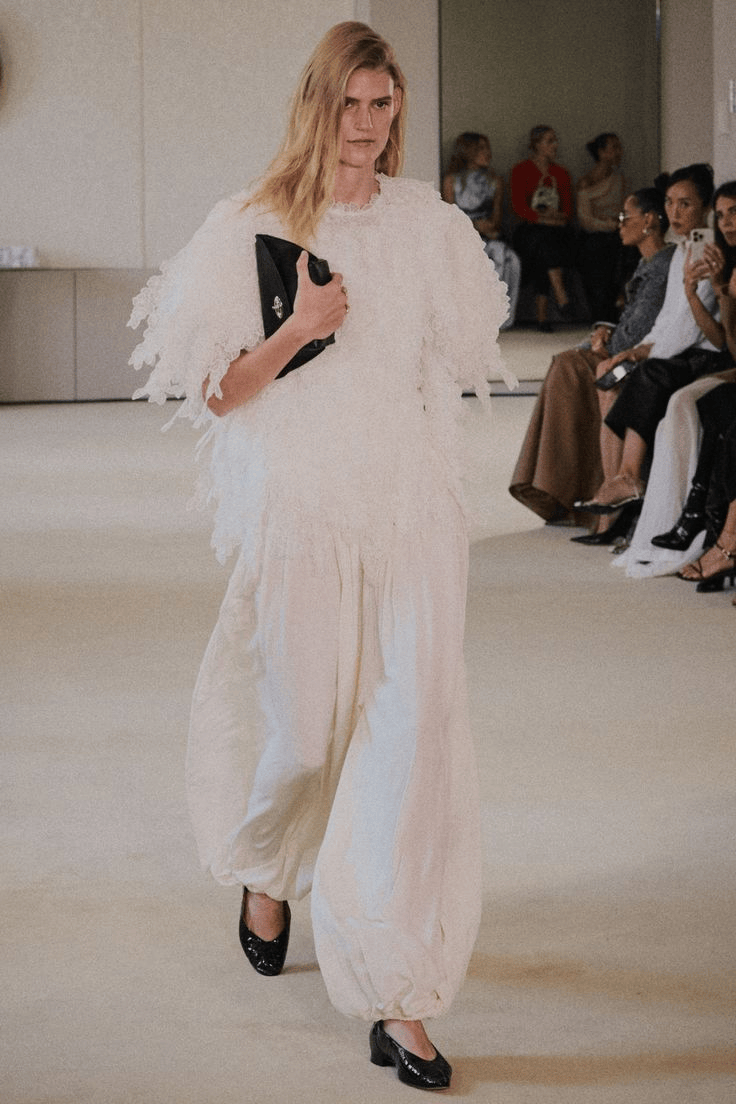 Joseph Altuzarra则展现了「云上舞白」作为工艺载体的另一面。品牌标志性的解构主义与浪漫细节,在白色基底上被凸显无疑。
