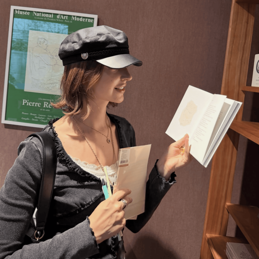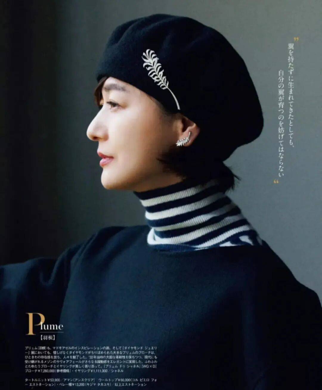 福冈佳子用一枚有设计感的银色胸针装饰贝雷帽,给造型注入了艺术感。▼
