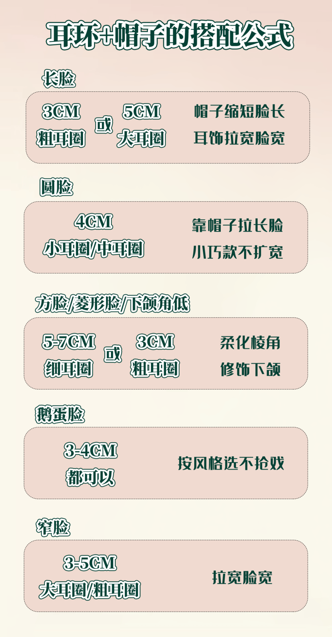 不过不同脸型,具体适合的帽子款式和耳环尺寸不同,给不同脸型的朋友推荐一些可以直接照抄的公式: