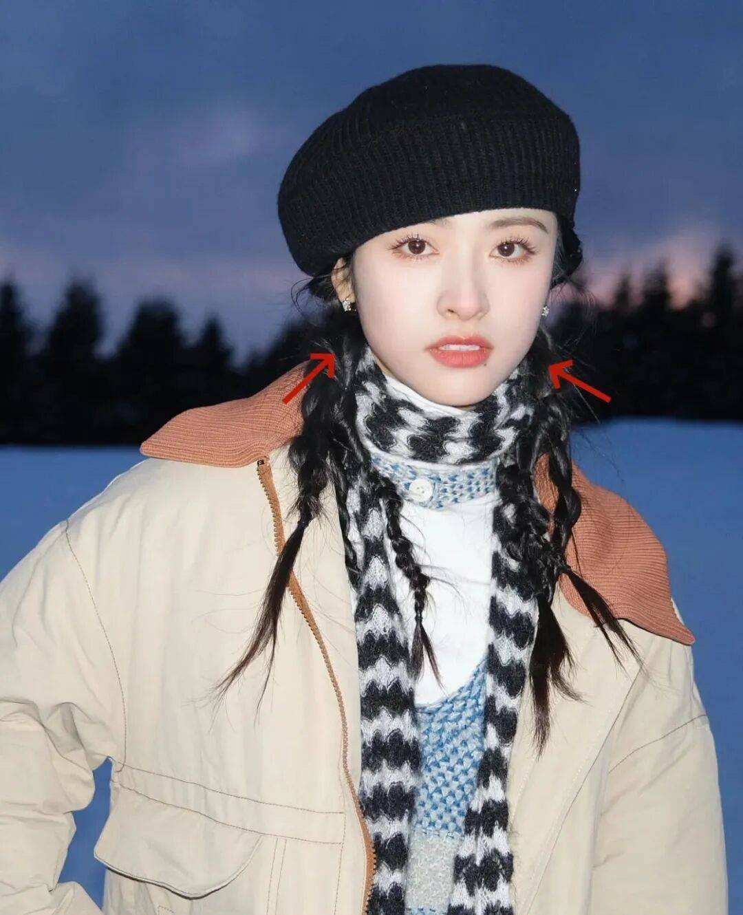 长脸可以参考迪丽热巴,直径3cm的粗hoop/5cm左右大耳圈。帽子可以选针织帽这种不会拉高颅顶的款式。▼