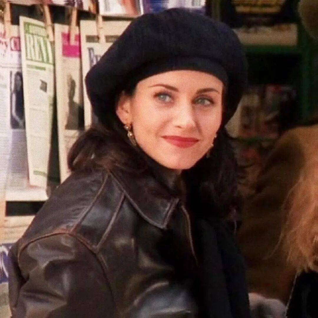 《老友记》中的莫妮卡也是,她选的贝雷帽也是大于自身头脸尺寸的款式,营造出了 “头包脸” 的柔和比例。