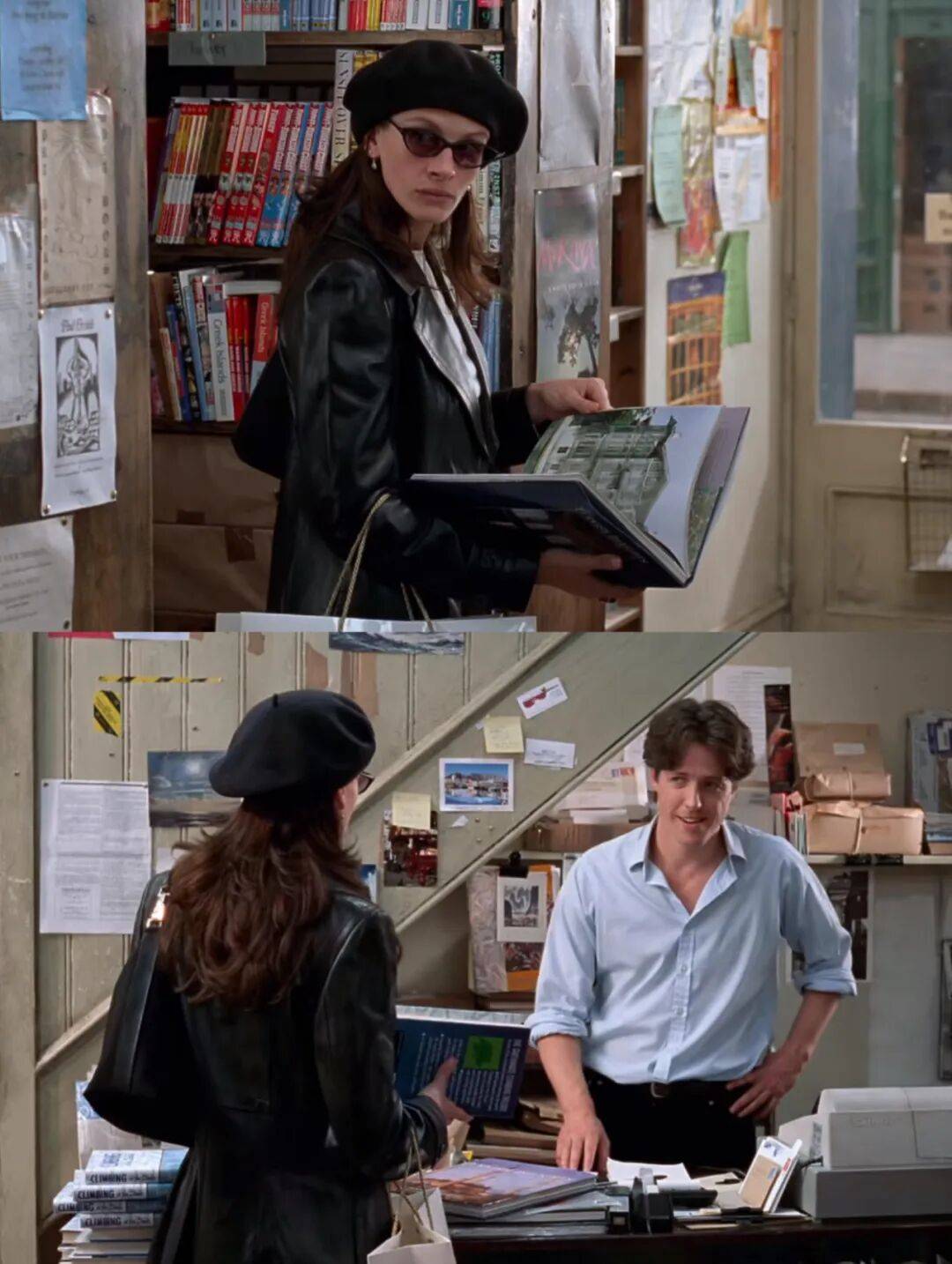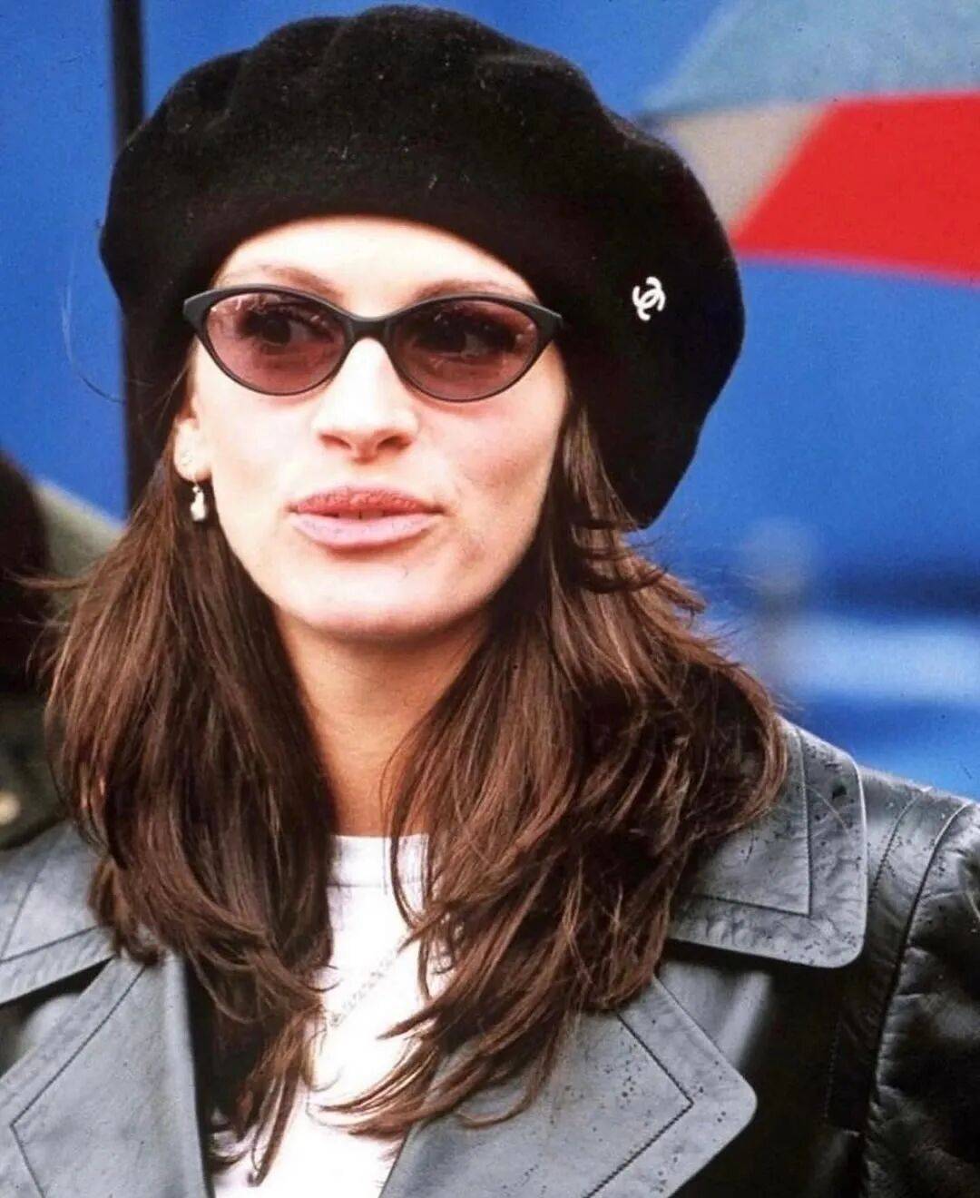 《诺丁山》里的茱莉亚·罗伯茨,目测帽檐宽度比她脸颊最宽处多出约6~8cm,既不会显头重,又能进一步收窄脸部线条。 ▼