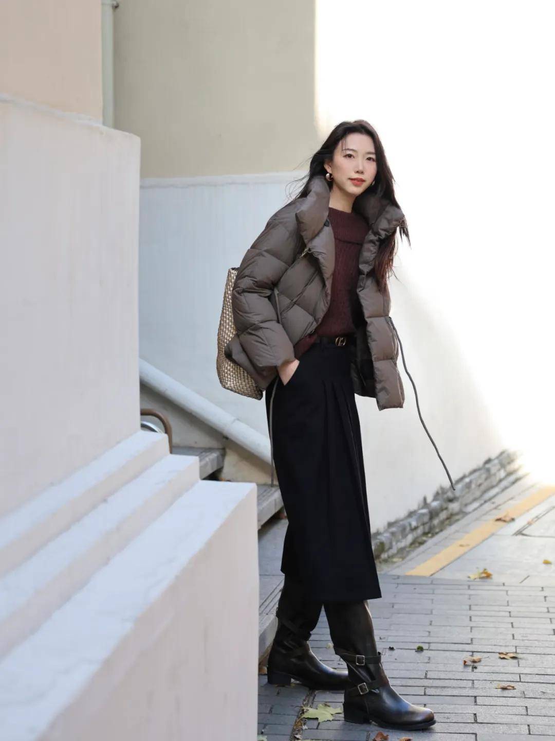在各种色彩搭配之中,深棕色和黑色的组合最能展现出一种高级的韵味。短款的深棕色羽绒服搭配一条黑色的直筒裙,整体低调内敛,又不缺时尚感。
