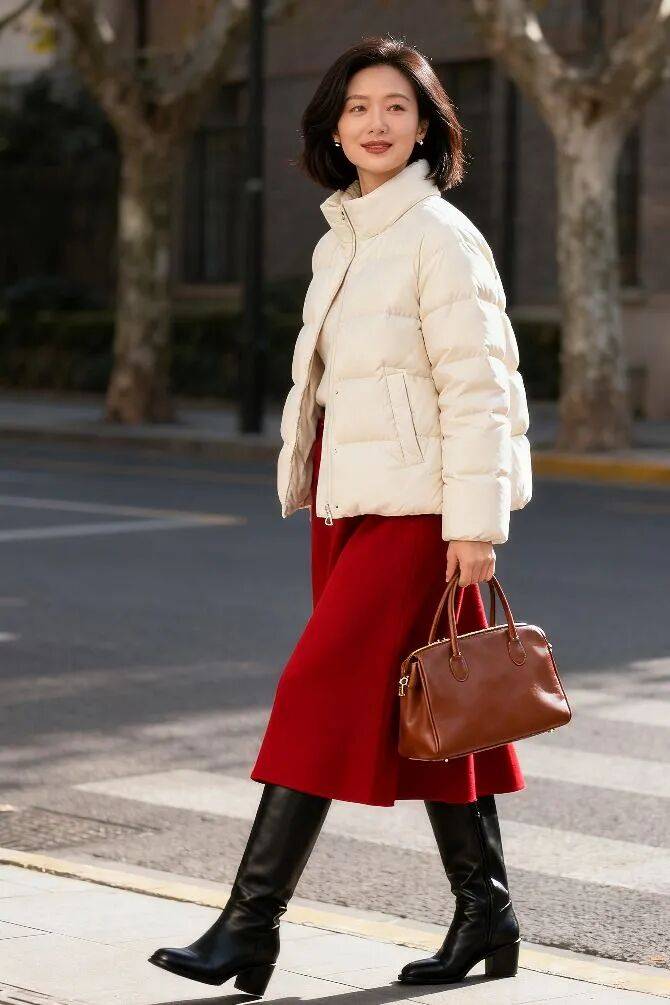 白色羽绒服的干净和红色A字裙的亮眼结合在一起,既保暖又时髦。