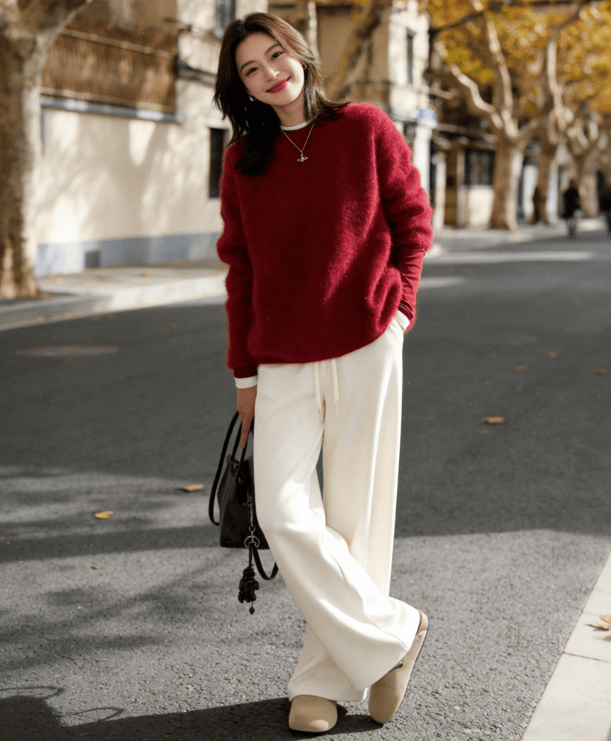红色的毛衣,软糯又舒服,贴身穿很温暖,很适合搭配咱们白色的直筒裤,简约又大方。