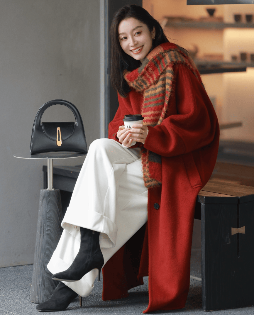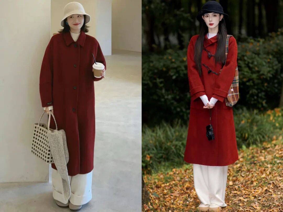 就像上图这样,长款的红大衣,版型宽松不挑身材,内搭简单的打底衫,下半身配一条白色的阔腿裤。