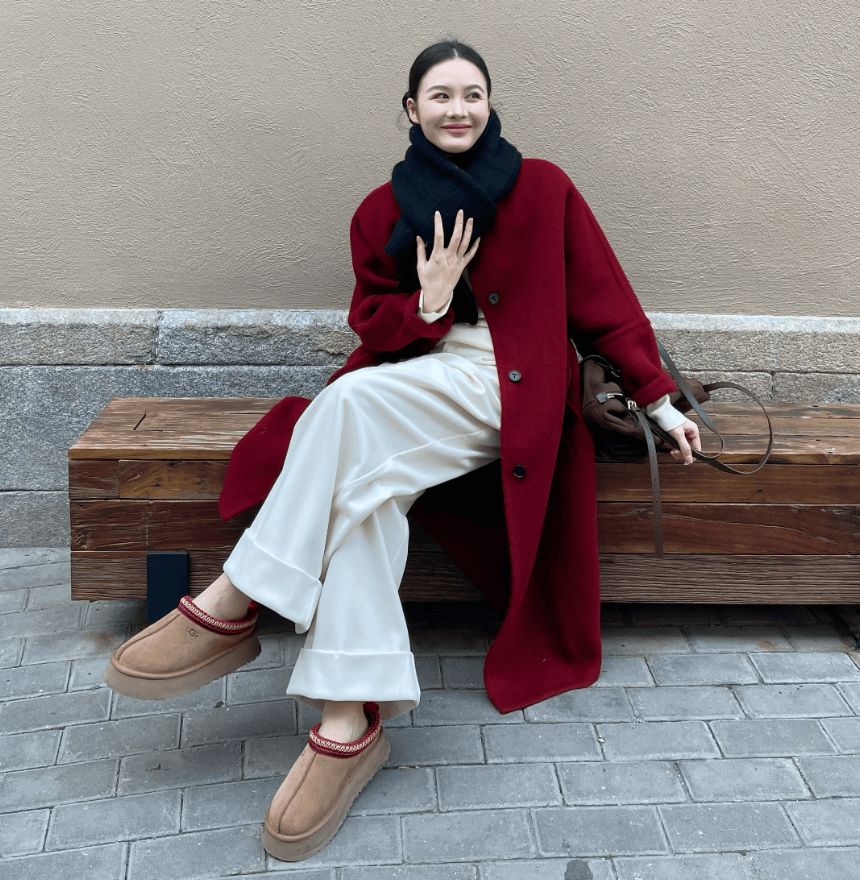 一件红色的大衣,是冬日里的亮眼单品,可以很轻松地穿出气场和气质,搭配一条白色的阔腿裤,能中和红色大衣的厚重感,显得整个人更轻盈。