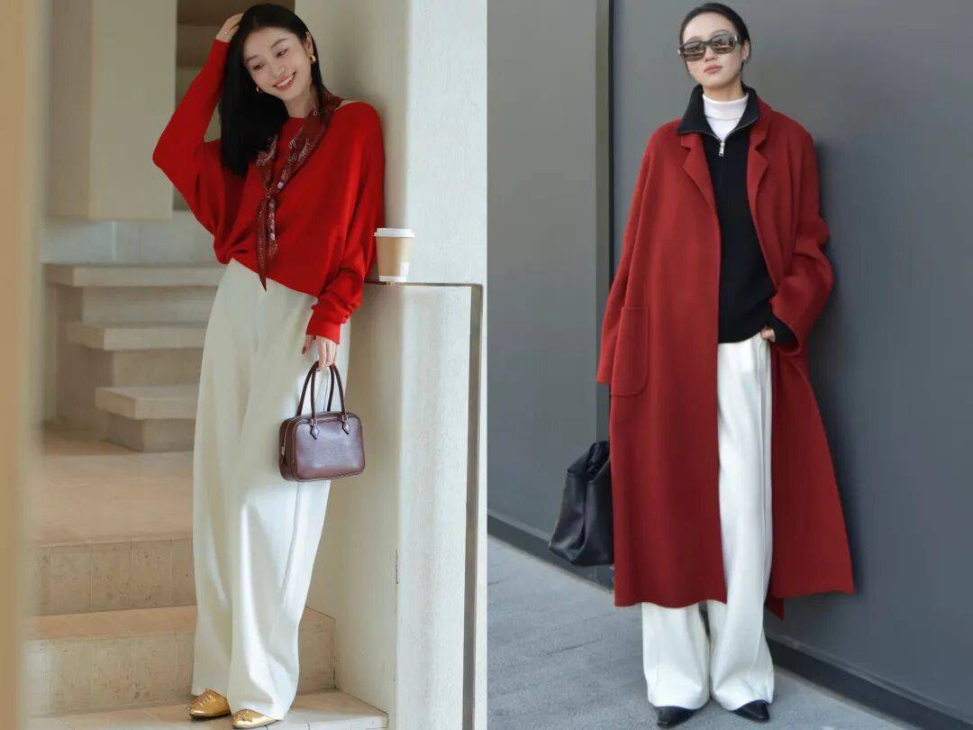 也可以换成短款的红色大衣,用来搭配一条垂坠感很好的白色阔腿卫裤。