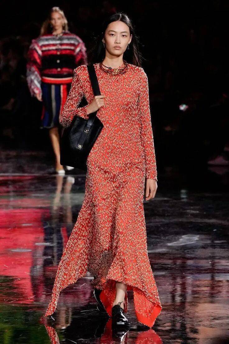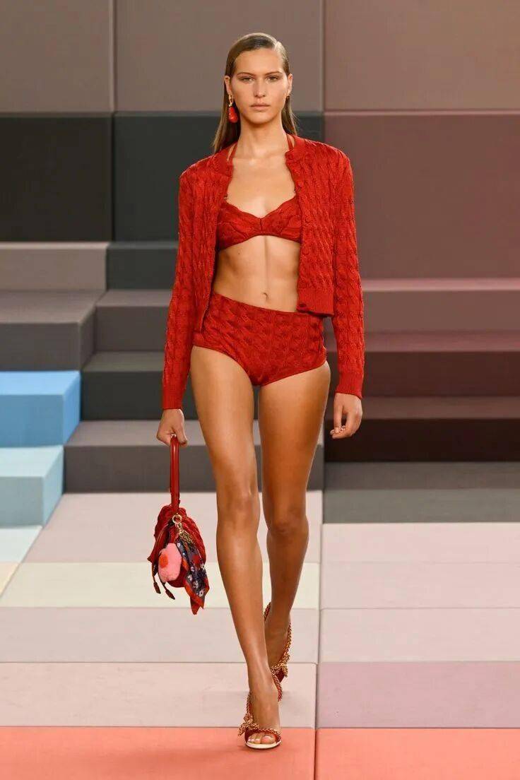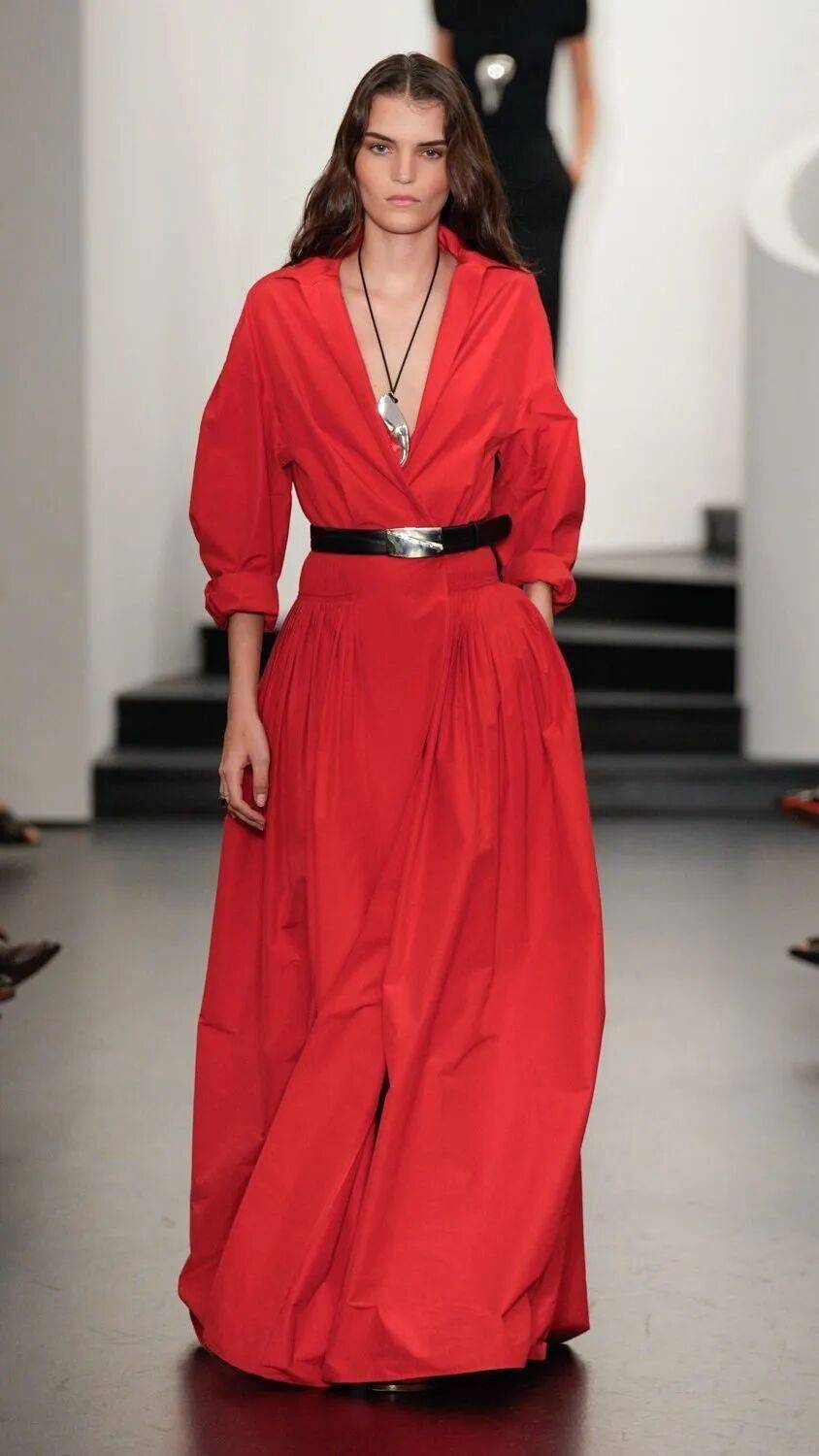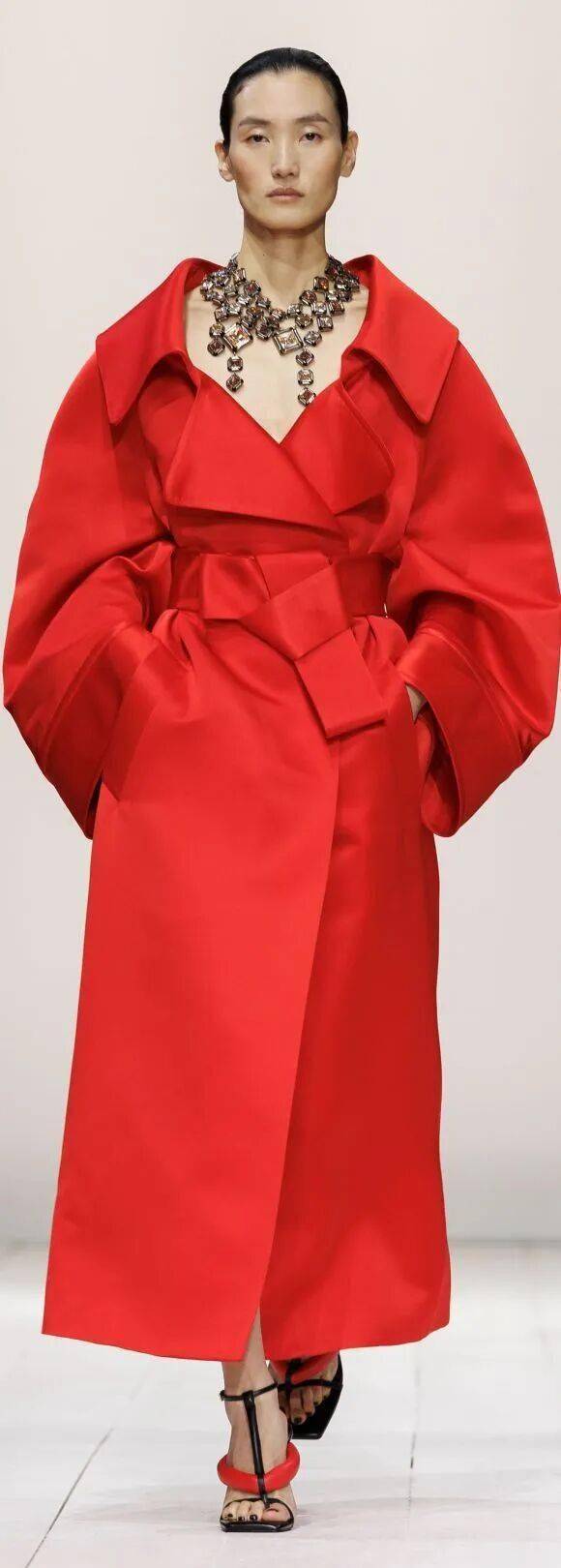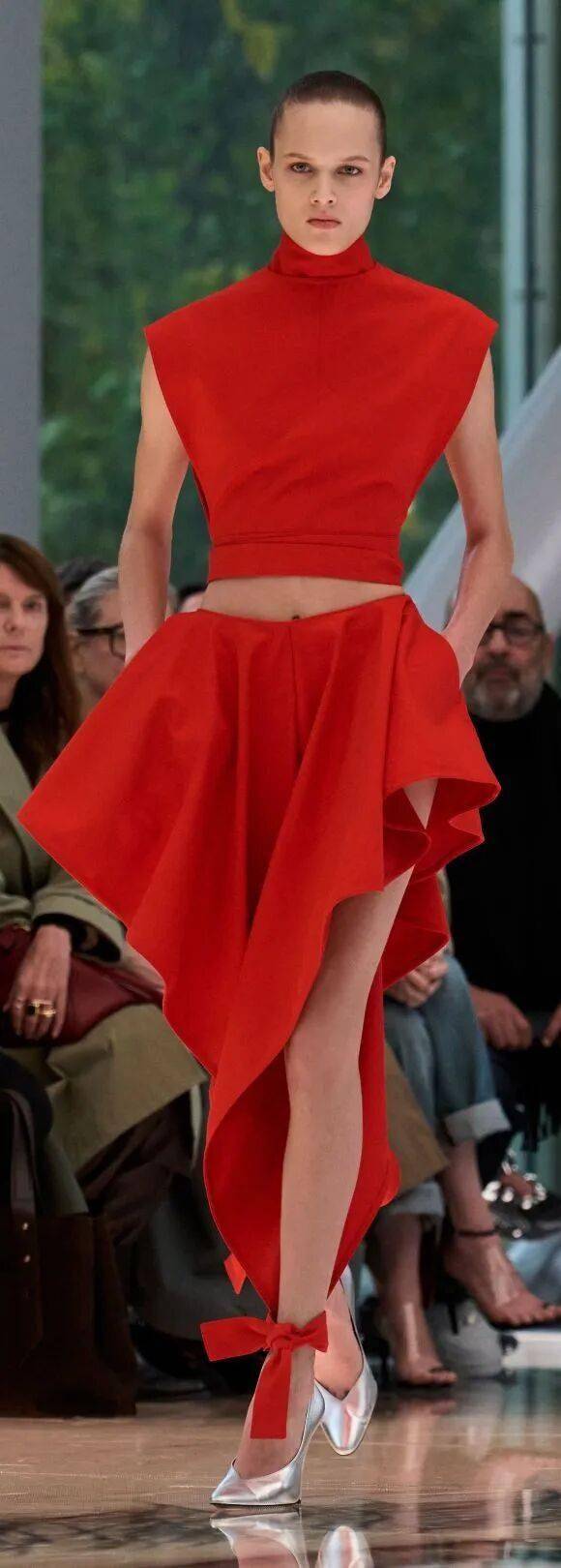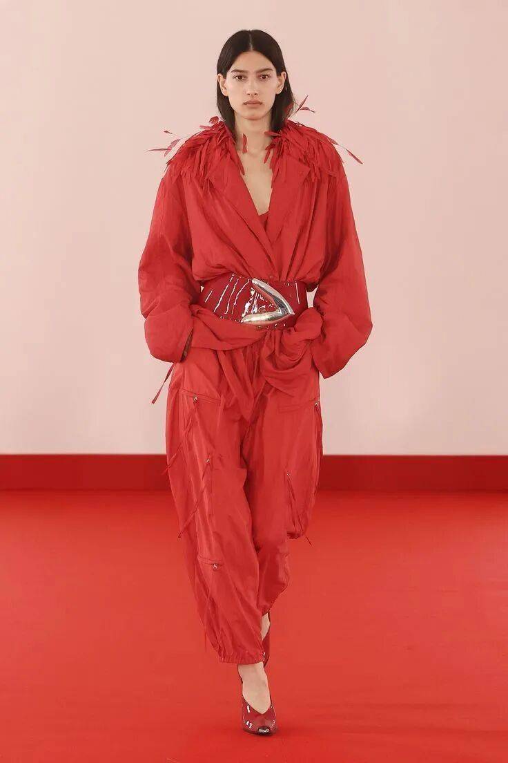 岩熔瀑布红无需赘述,它是除黑白外最具辨识度的经典色。本季将其列入流行清单,正因其超越基础色的表现力——既非黑白的无趣百搭,亦非普通彩色的平庸,而是以浓烈的情感浓度与驾驭难度,成为设计师彰显态度的利器。