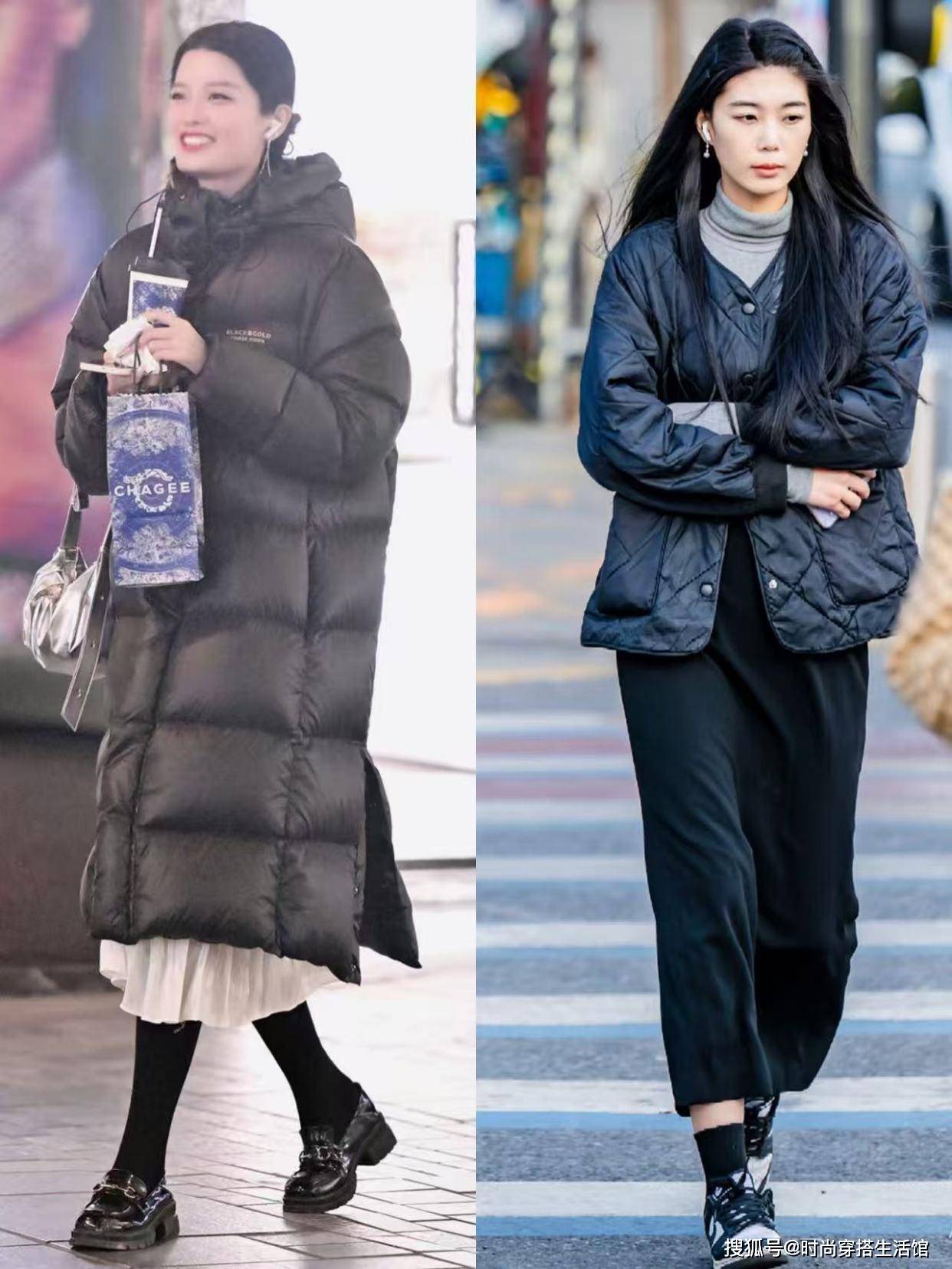 ②内搭塞进下装,羽绒服敞开穿强调腰线位置