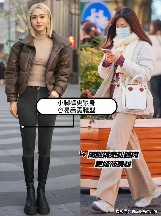 虽然说小脚裤能够弱化羽绒服带来的厚重感,但同时也会暴露腿部缺点,最常见的就是腿粗、腿型不直等问题,选择搭配小脚裤都会直接暴露出来,同时还会让整个造型的比例失去平衡,从而会影响整个塑形效果。