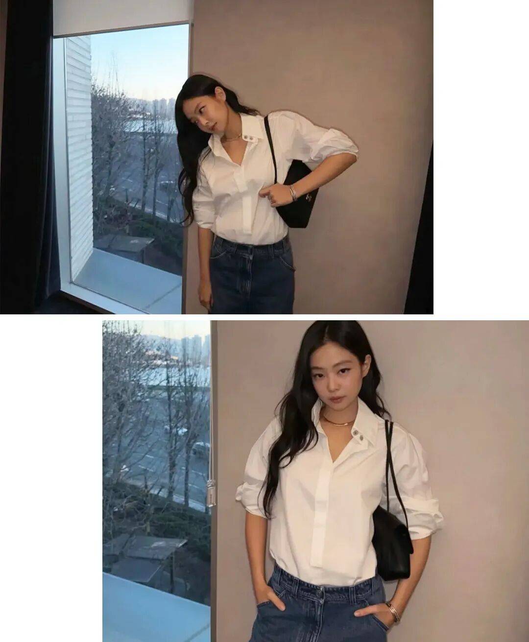 Jennie前阵子用一件极简的白衬衫和牛仔裤,就给出了最高级的穿搭示范。