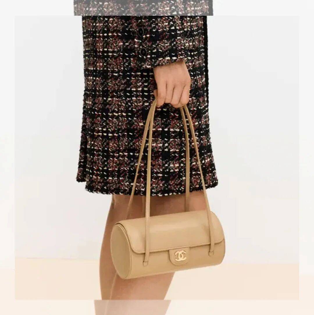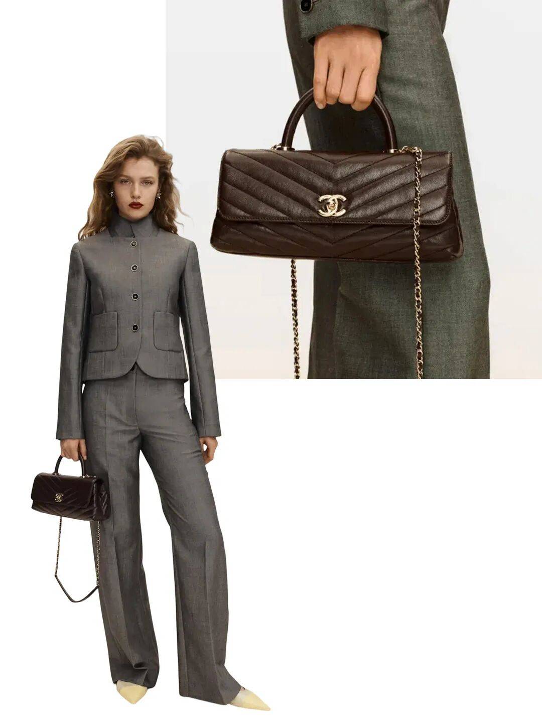颗粒压花小牛皮与金属棕色的组合,非常复古的小翻盖双c logo的扭锁开合,一整个透着松弛和高级的味道。