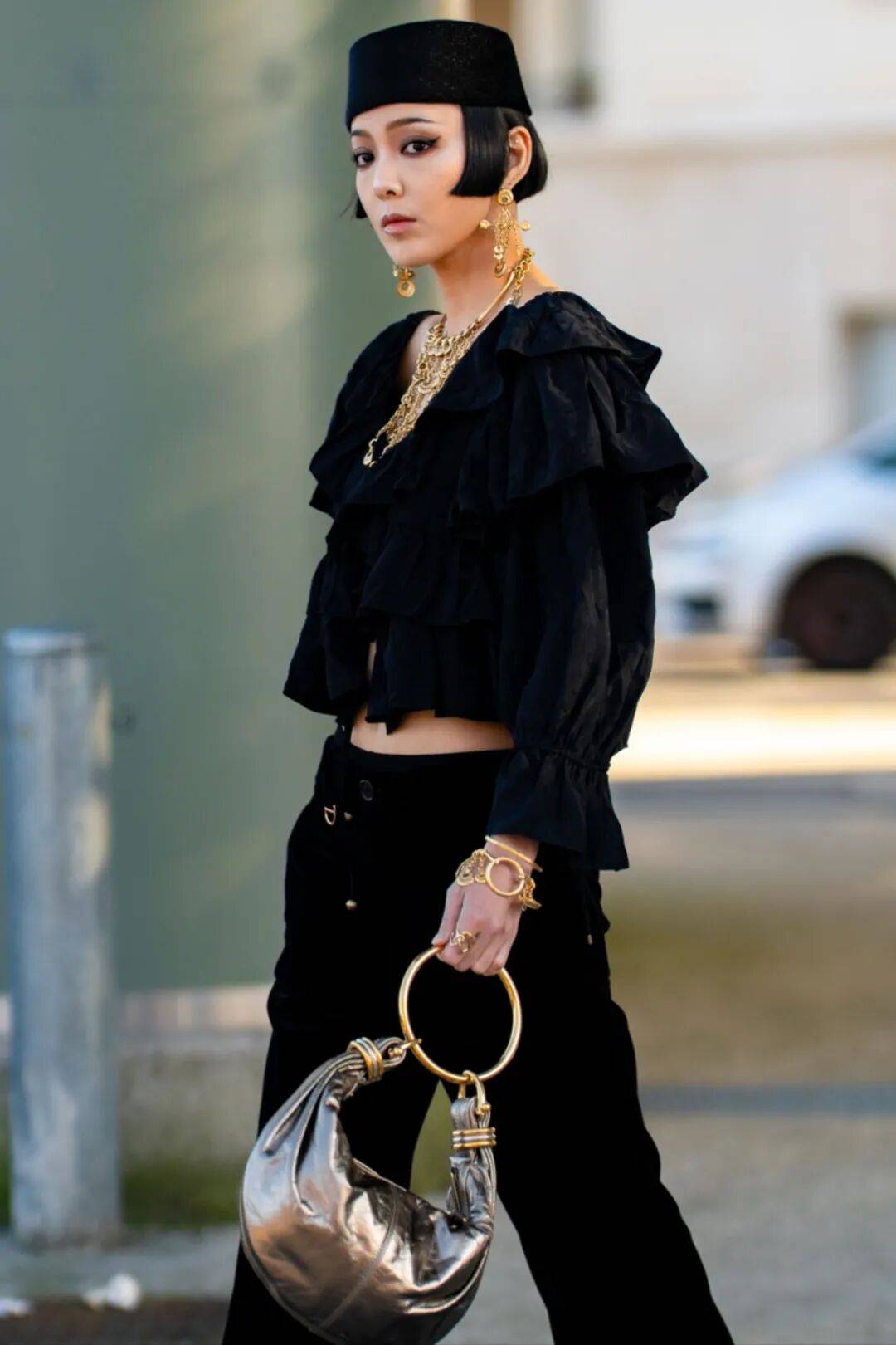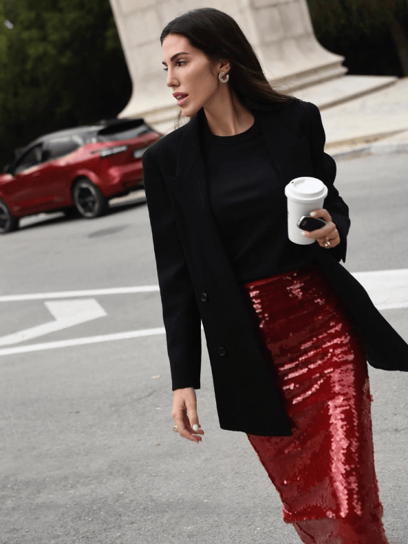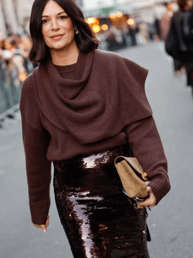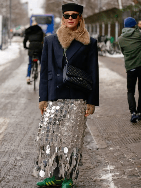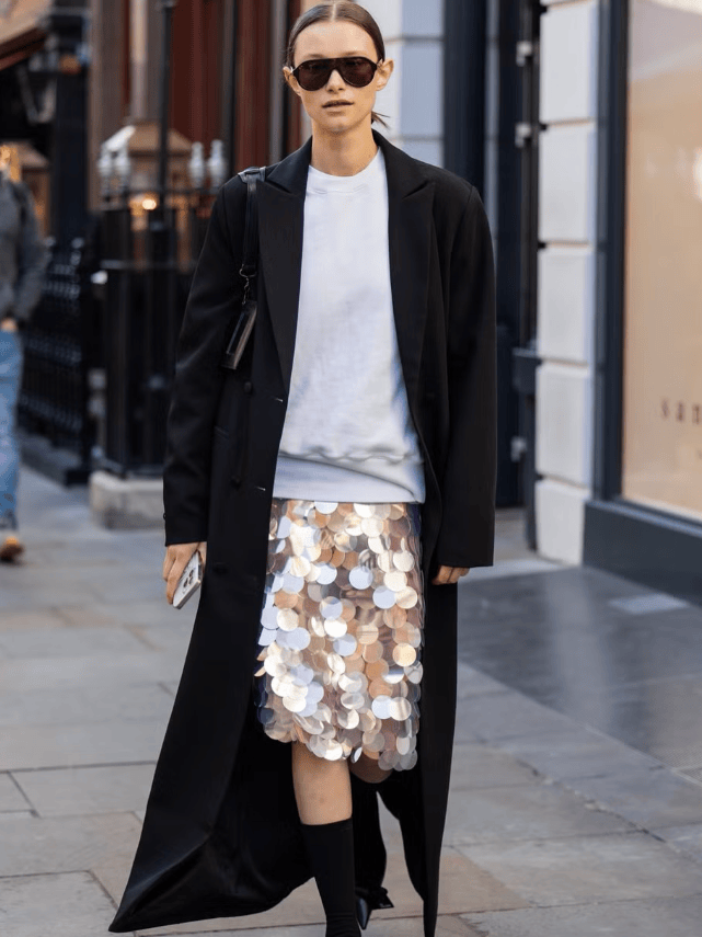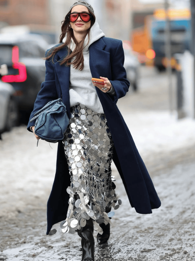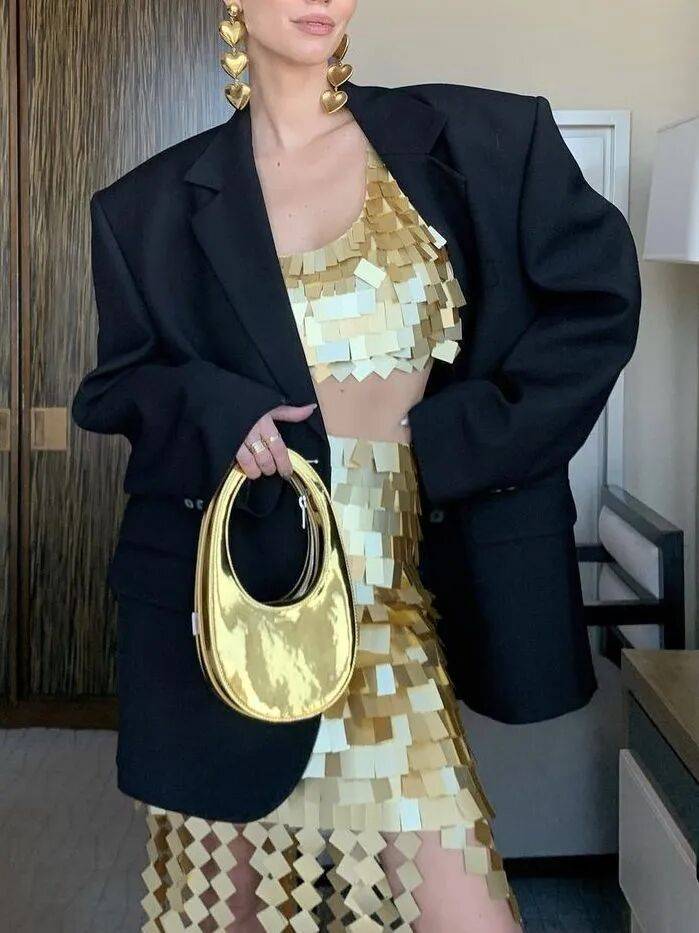 只需要把一套搭配中的任意一件替换成闪亮单品,便有恰到好处的高调时髦。