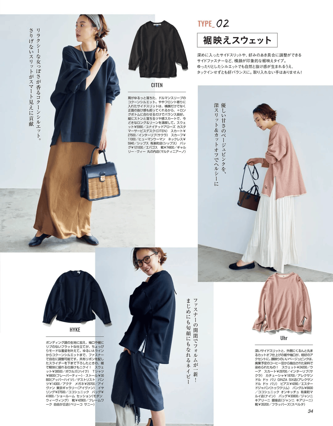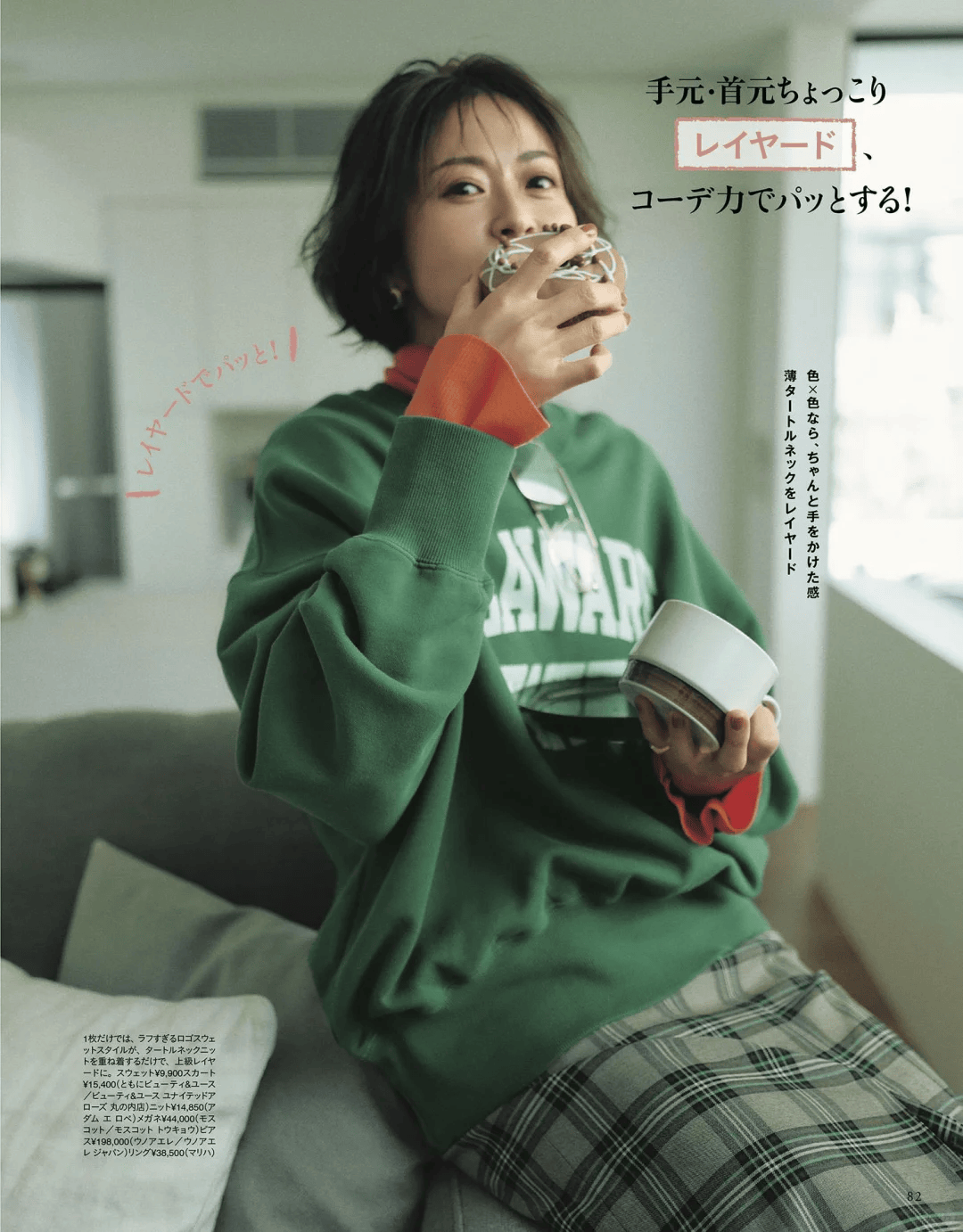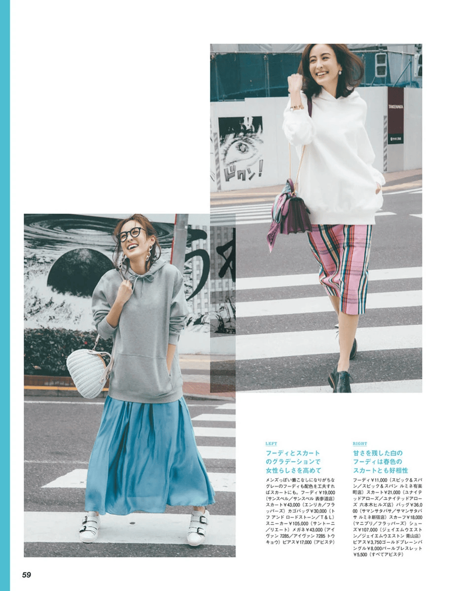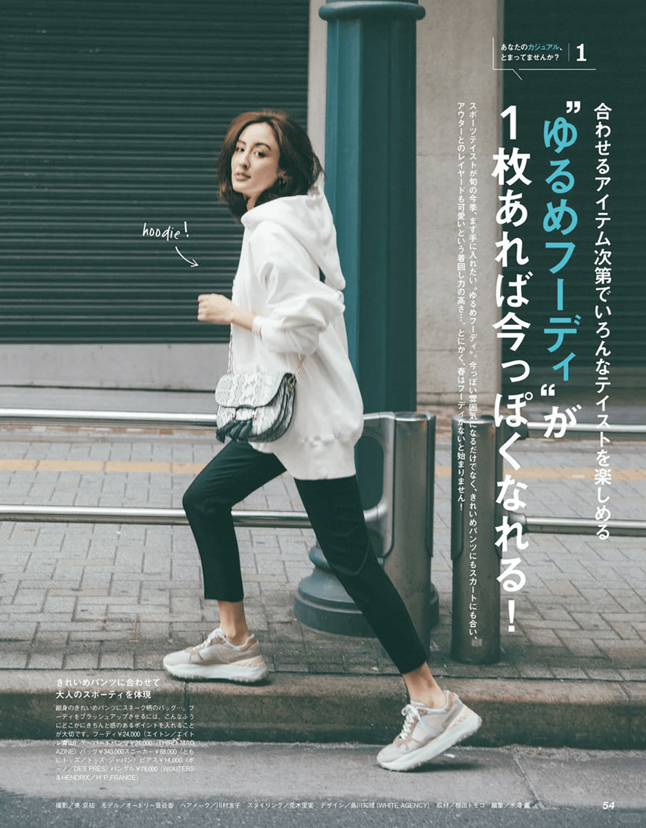 常见的宽松卫衣搭配小脚裤,上宽下窄,遮肉又显瘦,与烟管裤的组合更是可以修饰腿型,两种风格的碰撞更显时髦,卫衣+半身裙,更是将休闲与温柔相结合,让穿搭风格更加的多样化,日杂模特非常善于各种风格的混搭,而卫衣就是最佳选择。