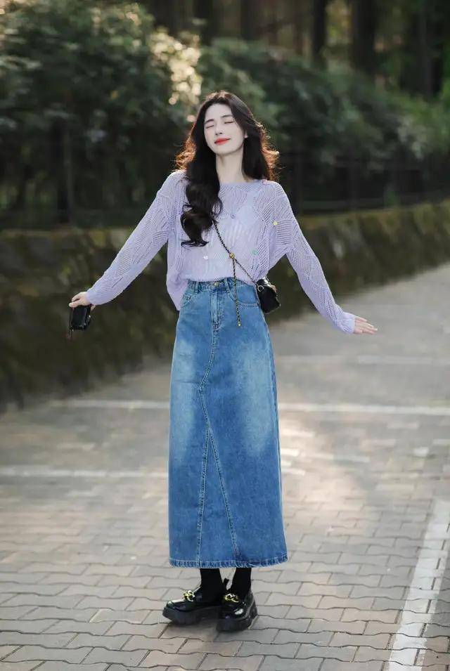 好比上面这一身穿搭,用浅紫色的镂空针织毛衣搭配上高腰收腰款的牛仔直筒半身裙,结合上大波浪的卷发造型,这样的少女感穿搭,不做任何推砌,而在取舍。