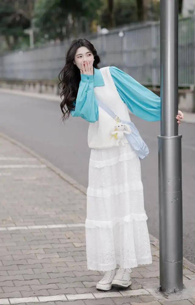 00 后的美少女穿初恋裙更加美得毫不费力。像上面这一条白色的薄纱裙子,搭配上浅绿色的针织开衫,是一种温柔感,同样是青春回甘。