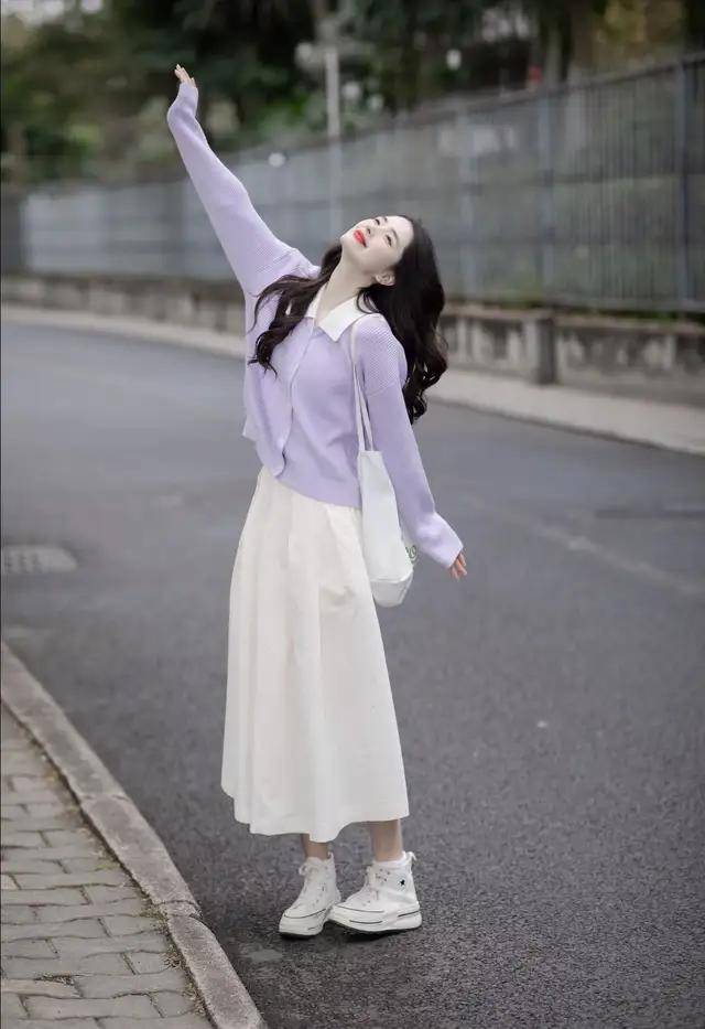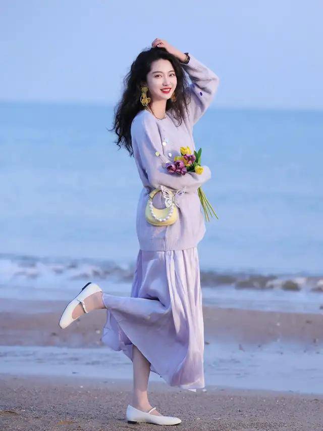 初恋裙是女人与重力之间为契约的浪漫,我们可以选择一件浅紫色的毛衣搭配浅紫色的半身裙,脚踩一双白色的浅口玛丽珍鞋,这样的穿搭去海边拍照就很出片。