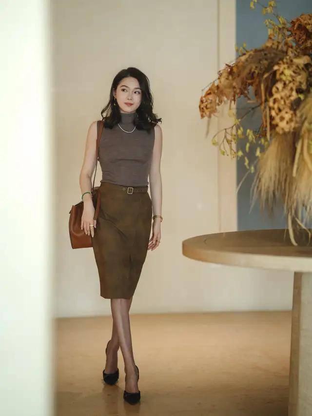 初恋裙和御姐风的裙子还是有一定的区别的,咱们就看上面这位时尚博风,用了一件无袖的针织毛衣,搭配上棕色的直筒半身裙,脚上穿的浅口高跟单鞋,肩膀上挎的棕色的包包,结合大烫的卷发造型,这样的打扮偏“轻熟风”,有着御姐的气质范。
