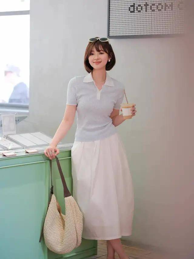 这个时候可以根据身材选择适合自己那条“初恋裙”,像上面这位时尚博主,身材也丰满,但她选择了一件针织短袖,搭配上白色的伞状半身裙,松紧结合的搭配更能呈现出她的身材优势。