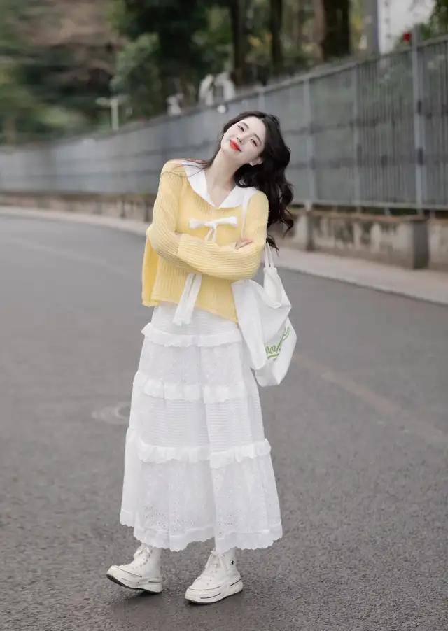 当我们用纯白色的蛋糕裙搭配上浅黄色的针织毛衣,形成一个撞色的效果,更好的形成高腰线,使得穿搭者的身材比例显高又显瘦。