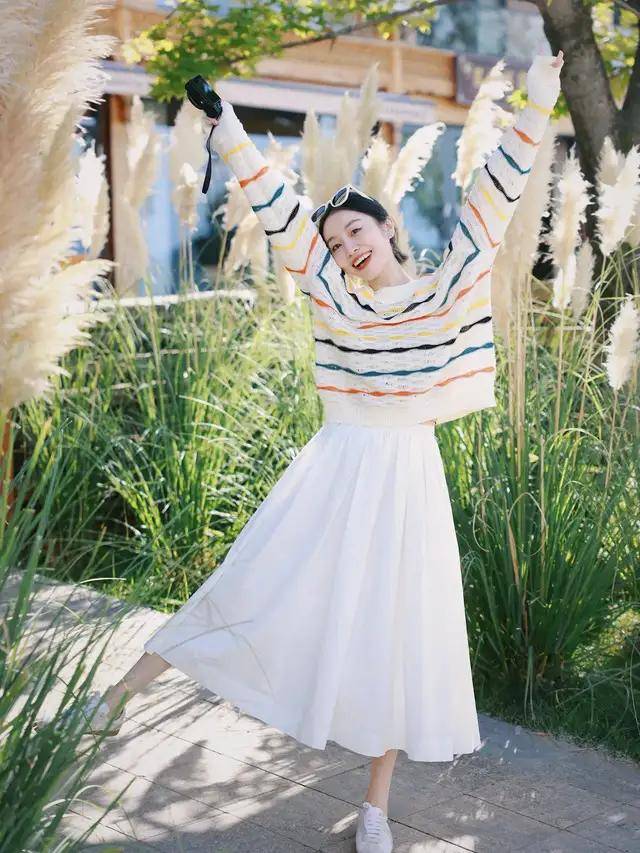 像上面这位时尚博主,直接选择一件拼接色的条纹针织毛衣,搭配上高腰收腰款的 A 字伞状半身裙,它便能自动贴合你的身形,不是羞涩,而是成全一种初恋的氛围感。
