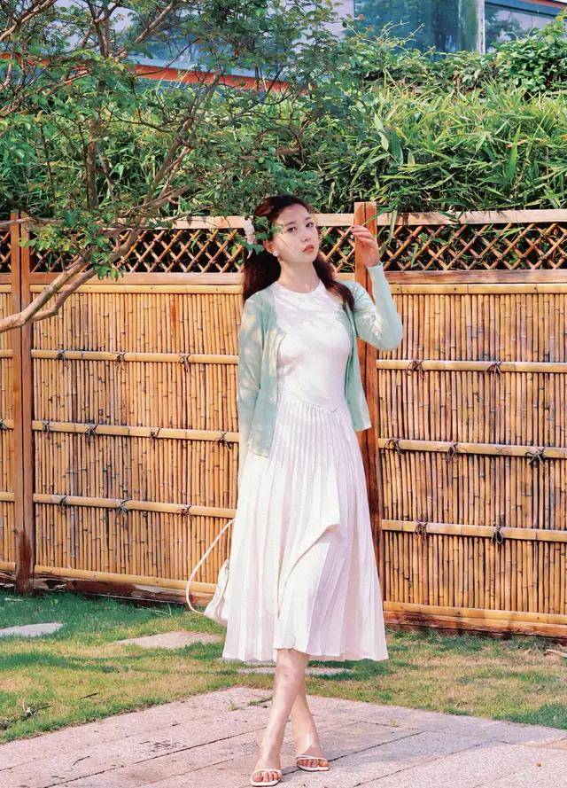 初恋裙同样也可以强调身材的曲线,也可以包容所有的起伏。我们可以选择外短内长的搭配方式。浅绿色的针织开衫搭配上白色的百褶连衣裙,脚穿一双高跟凉鞋。