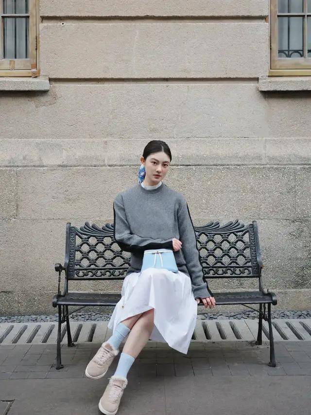 所谓的初恋氛围感,其实是做最简约的搭配,懂得做减法的穿搭就能降低出错率。例如用灰色的针织毛衣搭配上白色的伞状半身裙,基础色穿搭才是真正的时尚感,从不喧哗,但是时尚感是实实在在的。