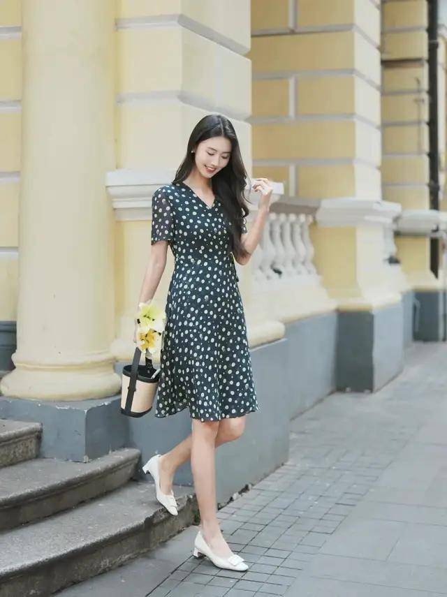 当然啦,我们穿初恋裙也不是为了取悦谁眼中的少女感,我们同样也可以换一条波点的高腰收腰连衣裙,脚踩一双浅口的单鞋,让自己有一种轻熟风的气质感,同样也很迷人。