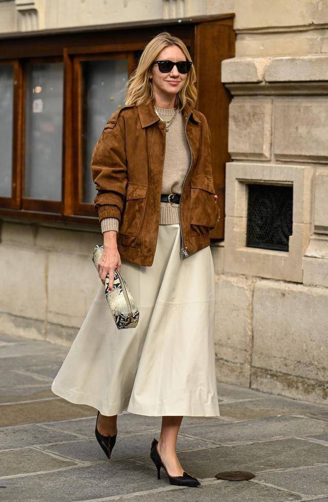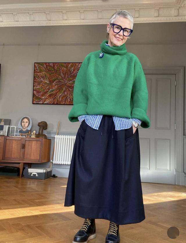 伞裙是我最为推荐大家去尝试的单品,什么是伞裙,就是上窄下宽的裙子,像一把伞一样慢慢撑开,不管你是什么腿型都能修饰,另外不会浮夸,即便六十七岁依然可以穿。