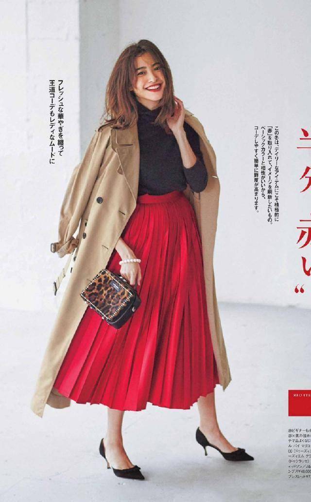 百褶裙的裙摆就是要大才有氛围感,如果是窄窄的,反倒少了几分韵味。红色百褶裙配黑色打底衫,是不出错的组合,配卡其风衣,又温柔又知性。