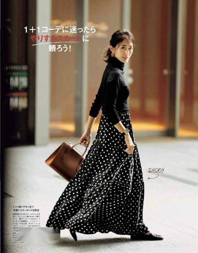 这件波点大裙摆裙一直收藏在我得收藏夹里,搭配黑色修身上衣,扎个低马尾,又优雅又浪漫,超好看的。
