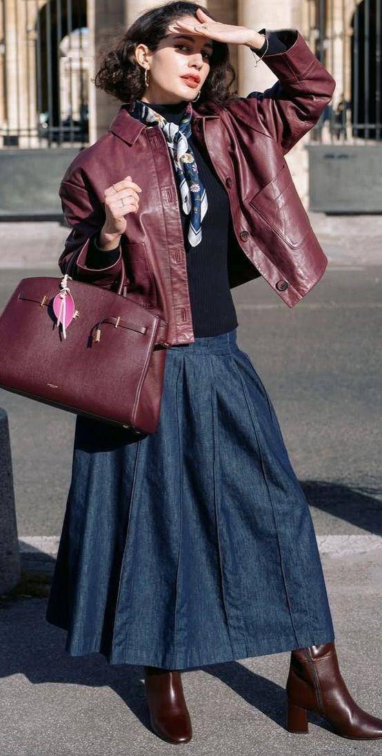 带一点百褶设计的牛仔伞裙自身赋有复古的气息,配黑色打底衫+棕红色短皮衣,红+蓝的,佩服饱和度低,不挑人,扎上一条小丝巾,显得格外的亮眼。