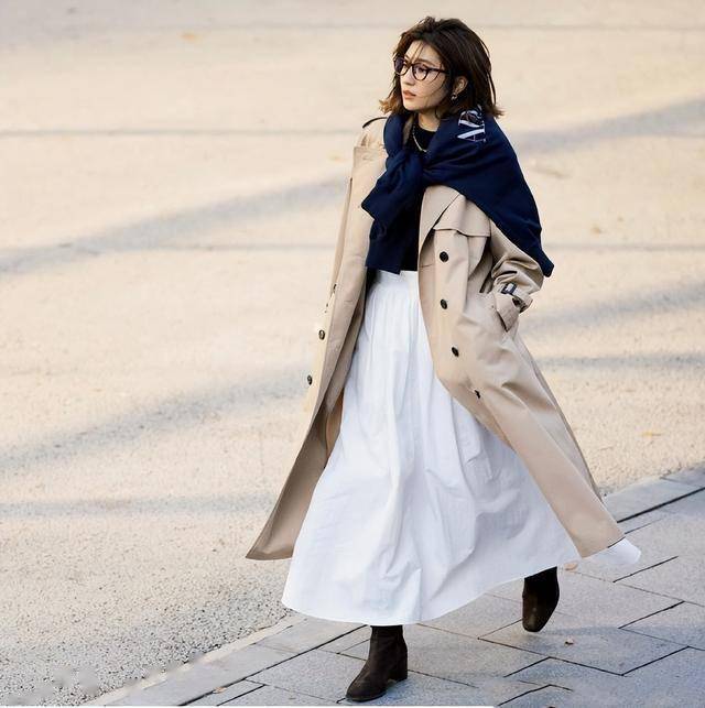 伞裙也是很多时尚达人的最爱,比如说这种白色伞裙,搭配黑色打底衫,外搭一件卡其风衣,优雅大方的通勤风。