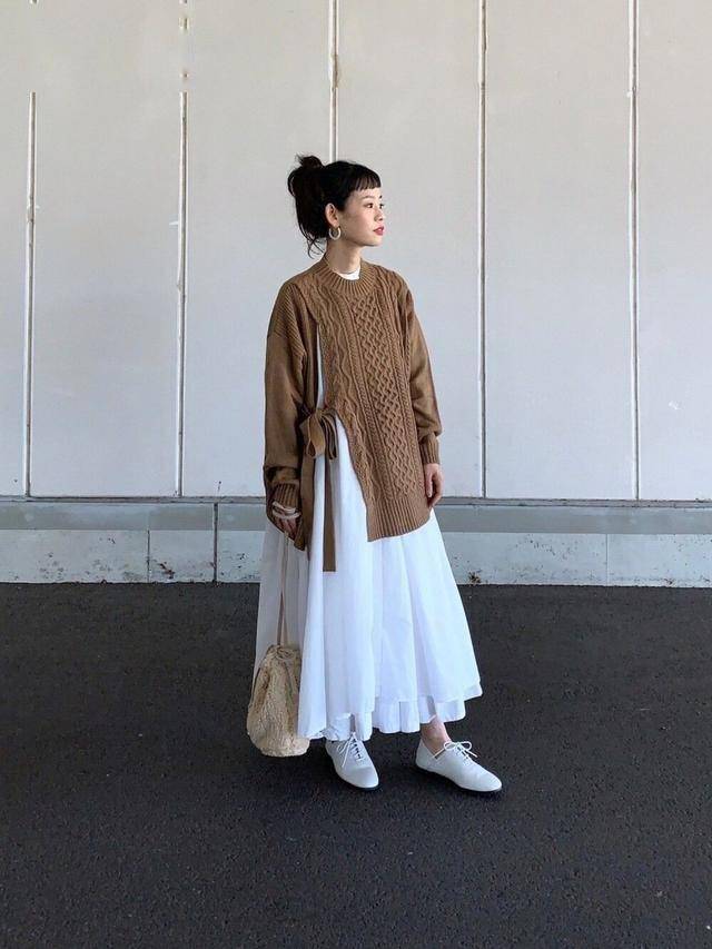 如果是连衣裙款式的伞裙,搭配这件侧边开叉设计的毛衣,风格独具一格,到白色小皮鞋,非常日系又减龄,即便小个子也能驾驭。