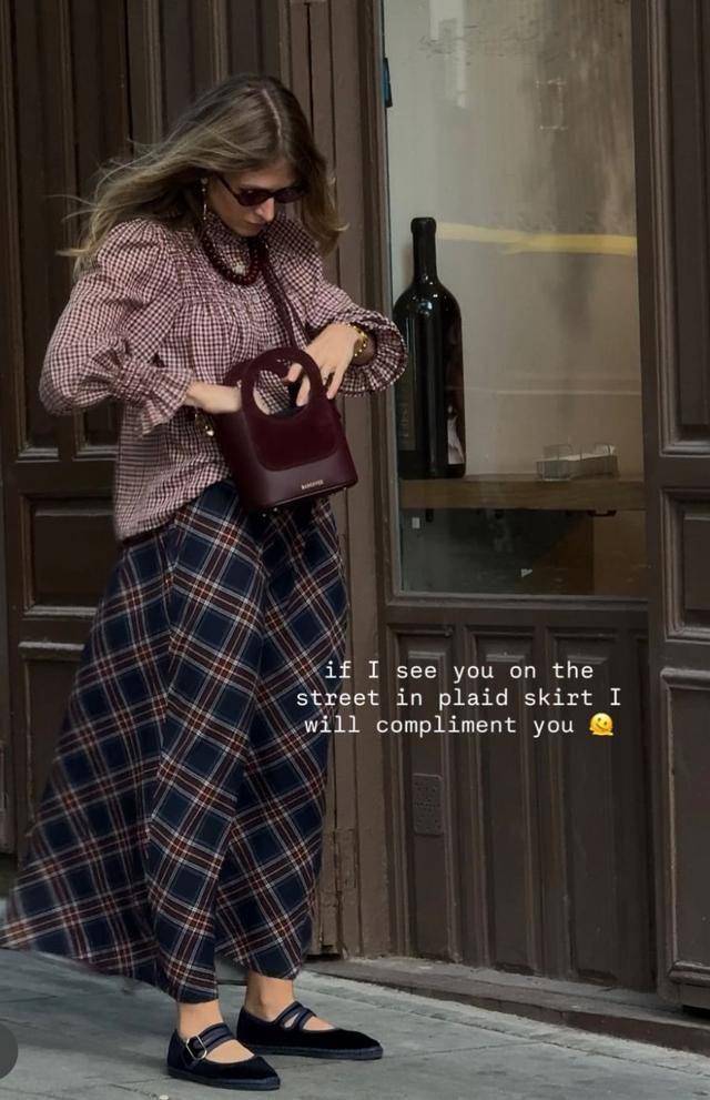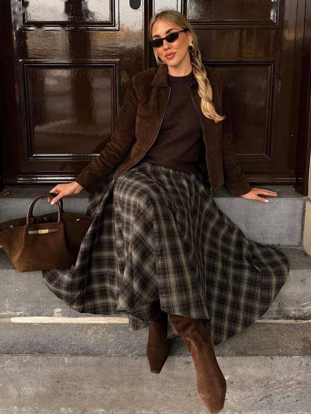 这两年还特别流行格子半裙,特别是不规则的设计,超大裙摆,搭配棕色上衣,透着几分时髦复古的气息。
