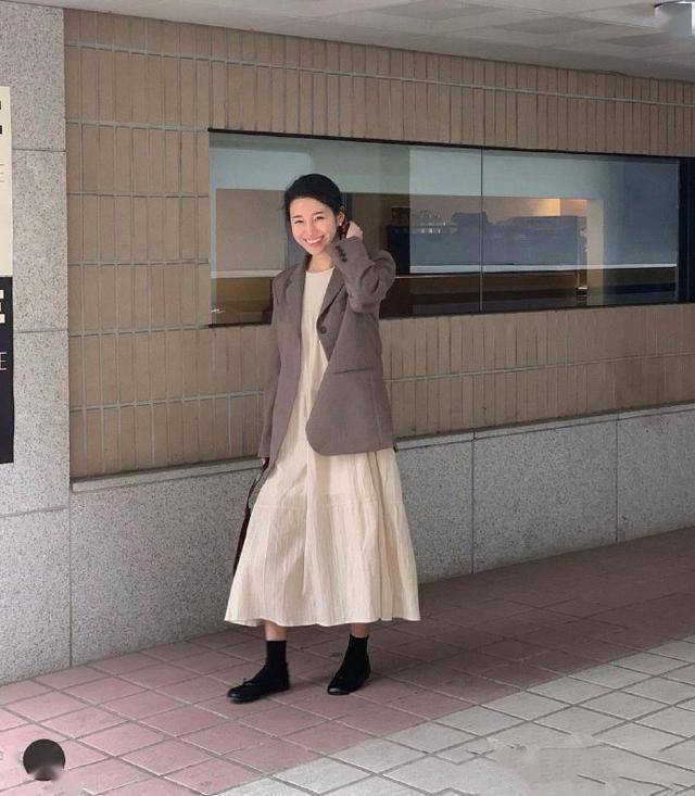 一条杏色微褶连衣裙搭配灰色西装,中长袜+黑色单鞋,简单大方的韩系风格。