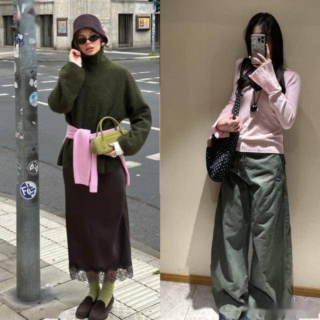 淡淡的粉色毛衣,搭配一条鼠尾草绿色的阔腿裤,饱和度不高,看起来很舒服,青春感满分。