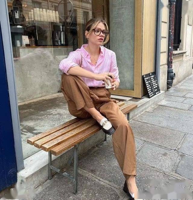 淡雅的樱花粉条纹衬衫,清爽干净又显得利落,搭配卡其色的西裤,少了甜腻感,也不容易出错,适合各种场合。