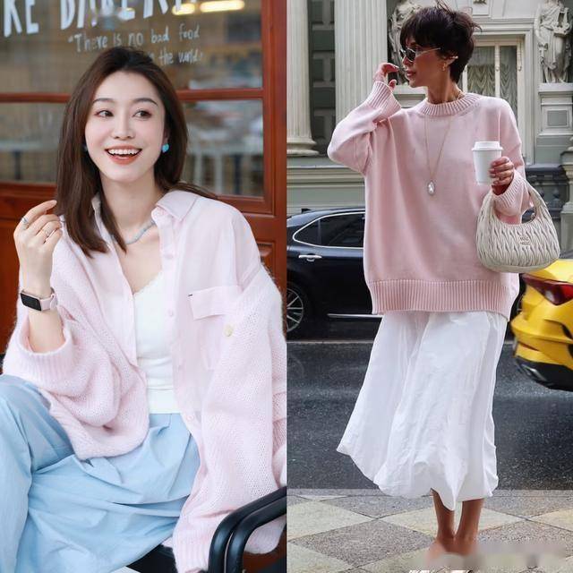粉色的毛衣外套,里面搭配白衬衫,像加了反光板很提亮肤色,又让粉色的毛衣变得干净轻盈,很减龄。