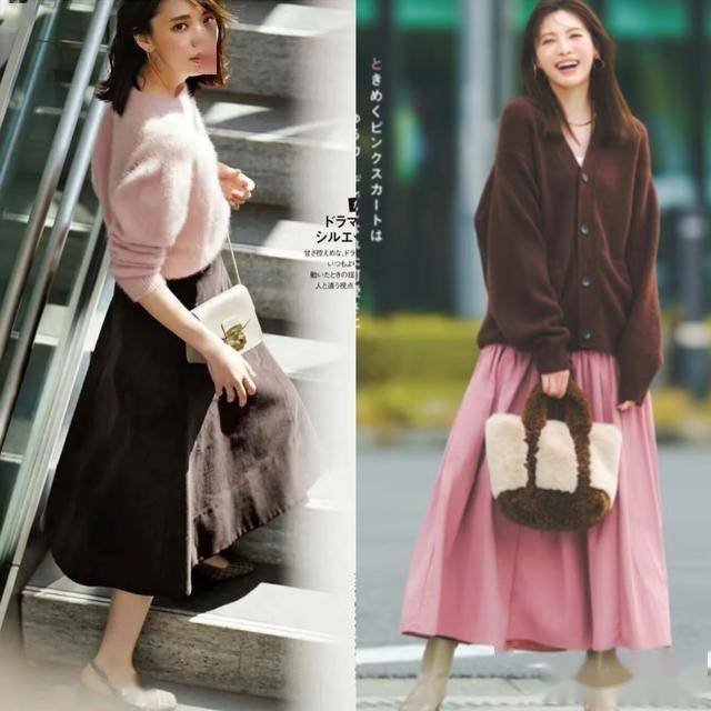 一件温柔软糯的粉色毛衣,带着温柔的女人味,搭配咖色的长裙,粉色跳跃感被咖色的沉稳压住,又显得生机勃勃,整体很有质感。